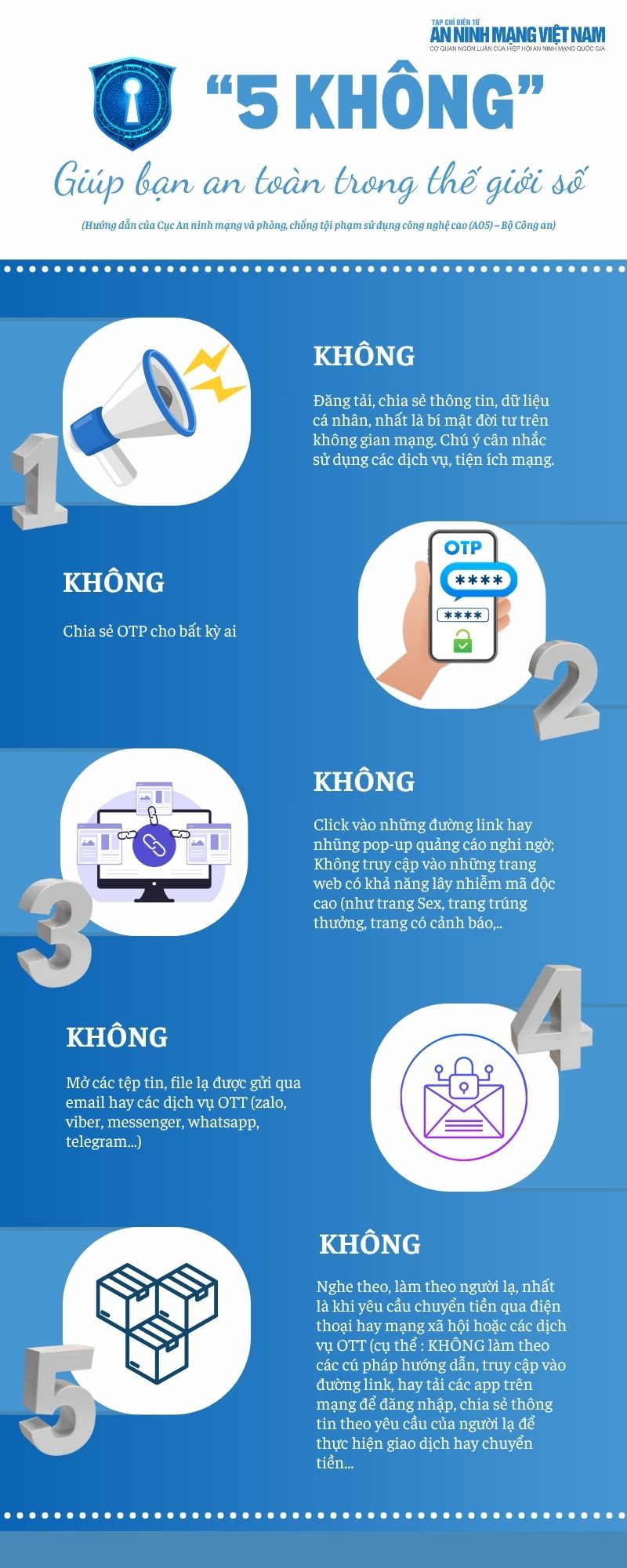 Trong bối cảnh tội phạm mạng ngày càng tinh vi, Thượng tá Nguyễn Đình Đỗ Thi - Phó Cục trưởng Cục An ninh mạng và Phòng, chống tội phạm sử dụng công nghệ cao (A05) – Bộ Công an cùng Hiệp hội An ninh mạng Quốc gia (NCA) giới thiệu bộ quy tắc “5 KHÔNG”. Đây là hướng dẫn thiết thực giúp người dân nhận diện, phòng tránh lừa đảo trực tuyến và bảo vệ an toàn dữ liệu cá nhân trong kỷ nguyên số.