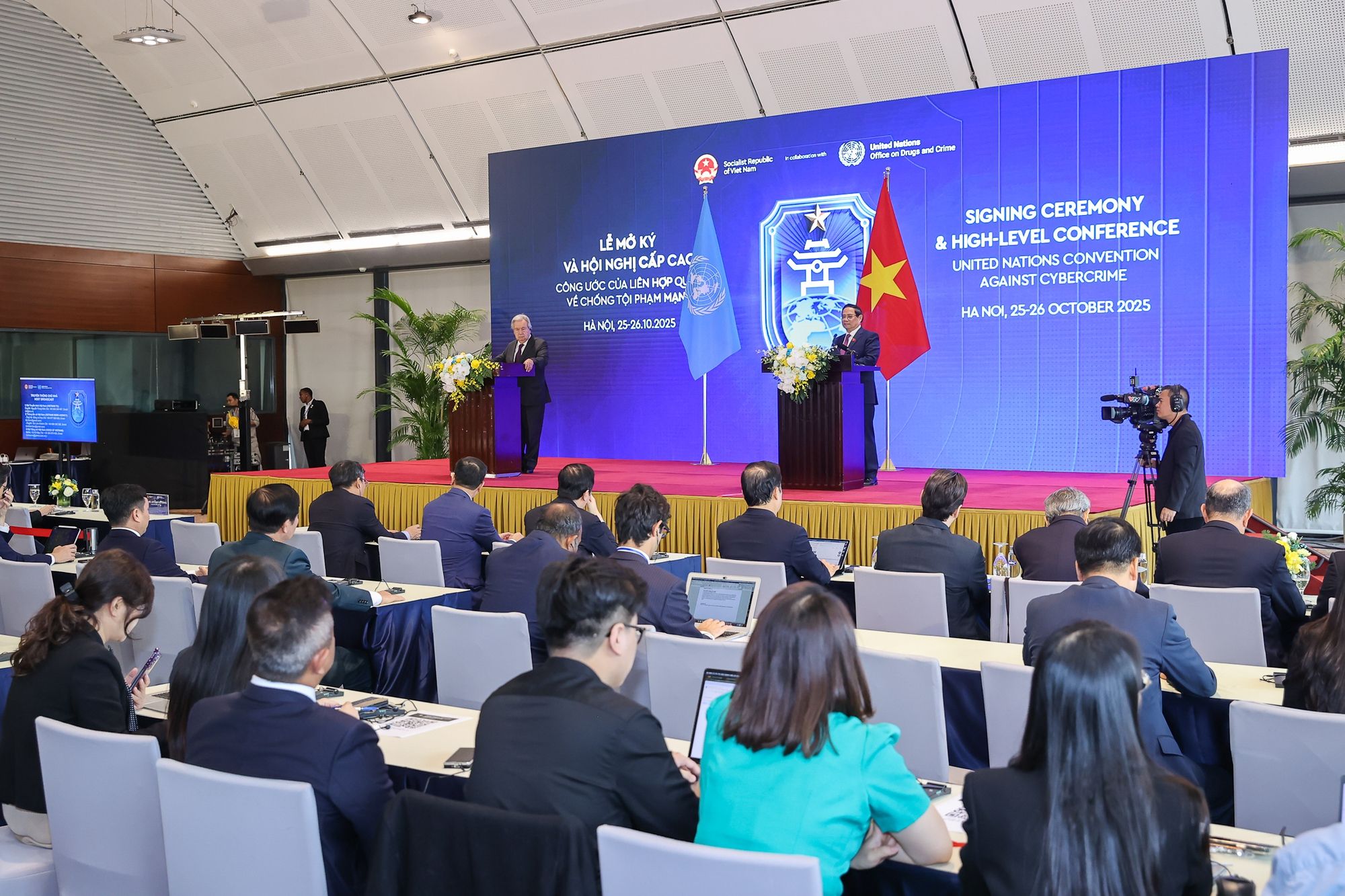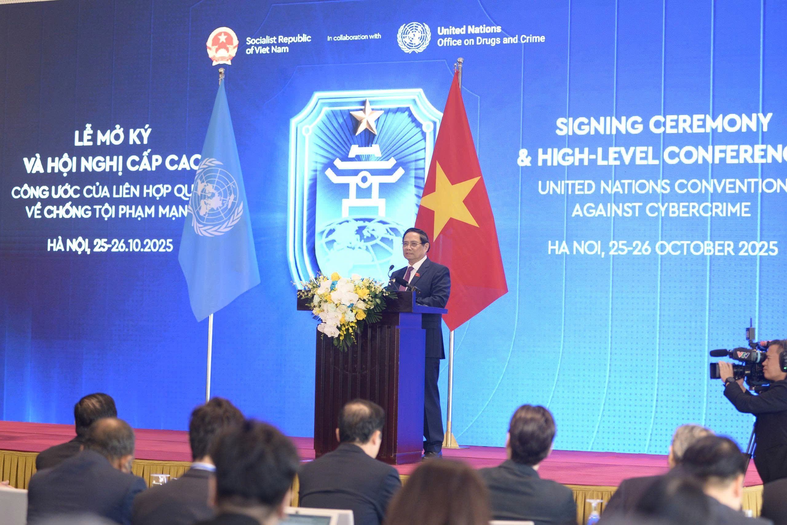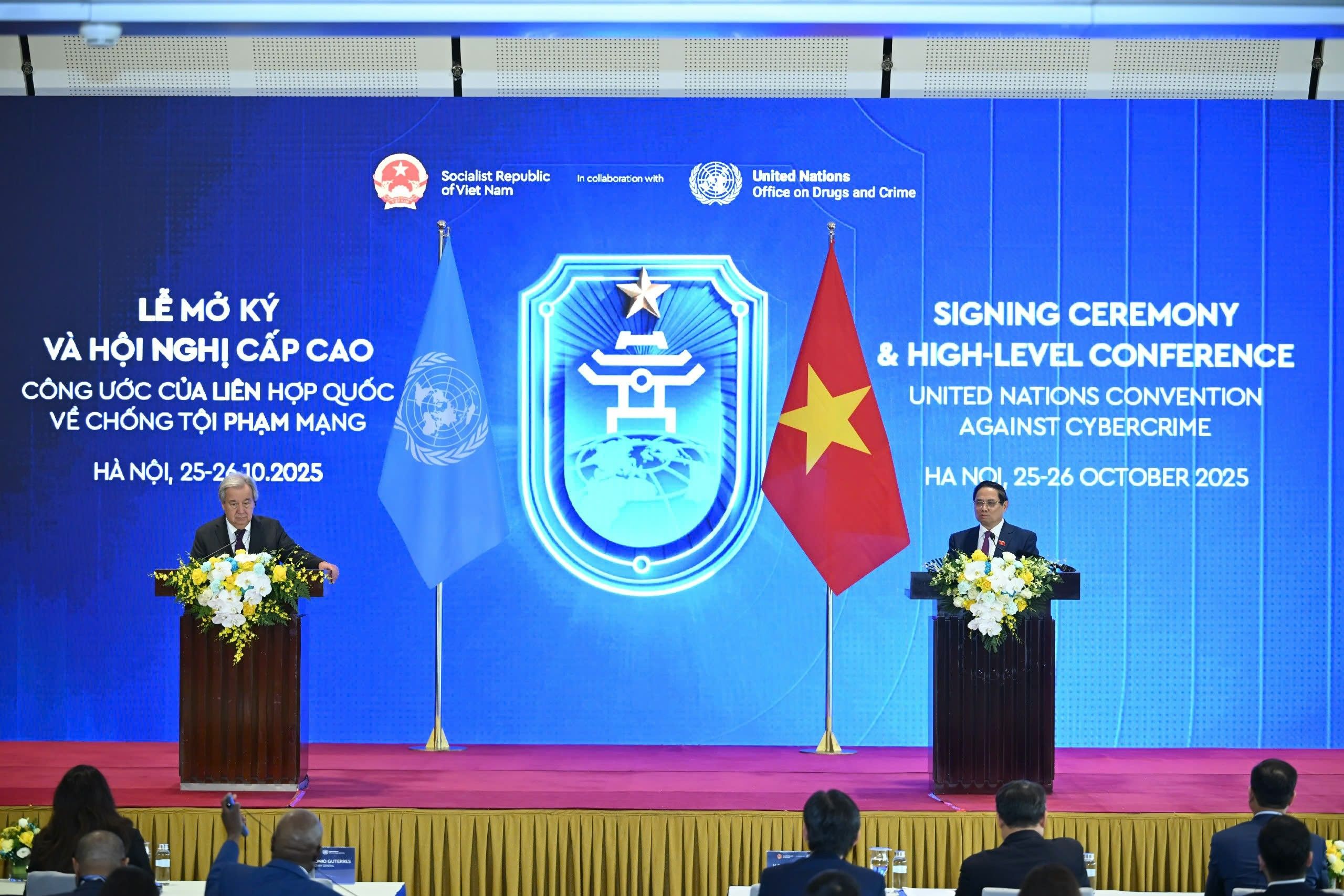 Phát biểu tại buổi họp báo, Thủ tướng Phạm Minh Chính gửi lời cảm ơn Tổng Thư ký Liên Hợp Quốc Antonio Guterres và các đoàn đại biểu quốc tế đã đến Hà Nội, “hiểu rõ hơn về Việt Nam, con người, văn hóa, đặc biệt là truyền thống hiếu khách của chúng tôi”. Thủ tướng nhấn mạnh, Thủ đô Hà Nội “Thủ đô của nghìn năm văn hiến, thủ đô của hòa bình” đây là nơi xứng đáng để tổ chức một sự kiện mang tầm vóc toàn cầu như Lễ mở ký Công ước của Liên Hợp Quốc về chống tội phạm mạng. Đây là một sự kiện có ý nghĩa lịch sử.