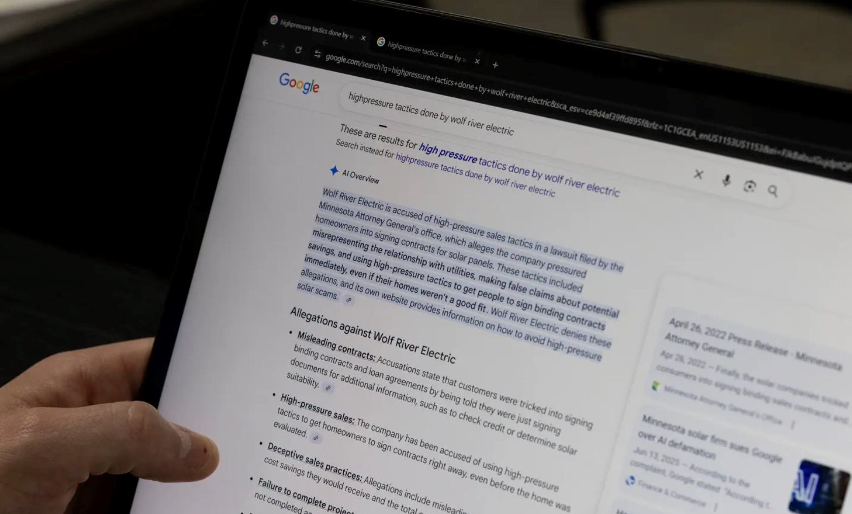 Một sáng tháng 6, công ty năng lượng mặt trời Wolf River Electric tại bang Minnesota (Mỹ) bất ngờ nhận thấy lượng khách hàng sụt giảm mạnh bất thường. Nguyên nhân khiến họ sửng sốt: khi tra cứu tên doanh nghiệp trên Google, phần “AI Overview” – tính năng do hệ thống AI của Google tổng hợp – lại hiển thị dòng thông tin cho rằng công ty này đang bị Tổng chưởng lý bang Minnesota kiện vì “lừa đảo khách hàng, che giấu phí và ép ký hợp đồng”. Tuy nhiên, trên thực tế, Wolf River chưa từng liên quan tới bất kỳ vụ kiện tụng nào.