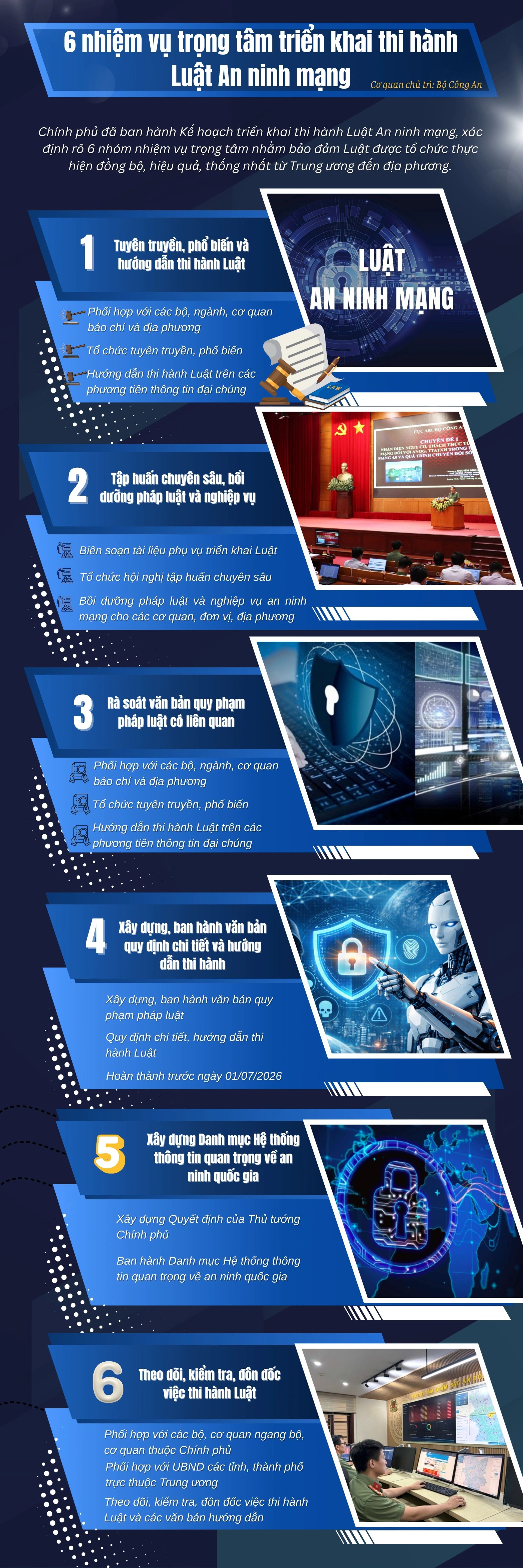 Cùng với đó, Bộ Công an sẽ chủ trì biên soạn tài liệu và tổ chức các hội nghị tập huấn chuyên sâu, bồi dưỡng pháp luật, nghiệp vụ an ninh mạng cho các cơ quan, đơn vị, địa phương. Hoạt động này hướng tới mục tiêu nâng cao năng lực tổ chức thực hiện, bảo đảm các quy định của Luật được áp dụng đúng, đầy đủ và hiệu quả.
