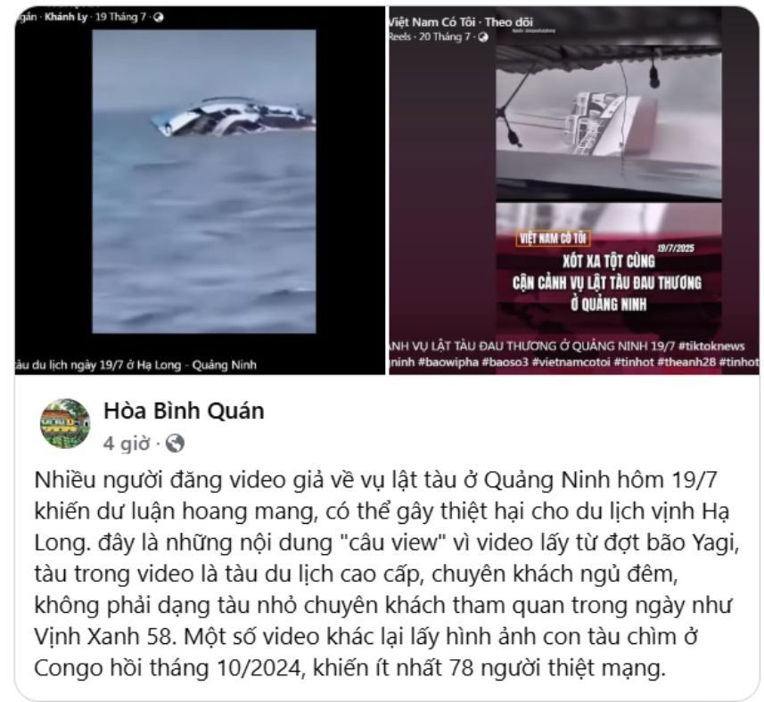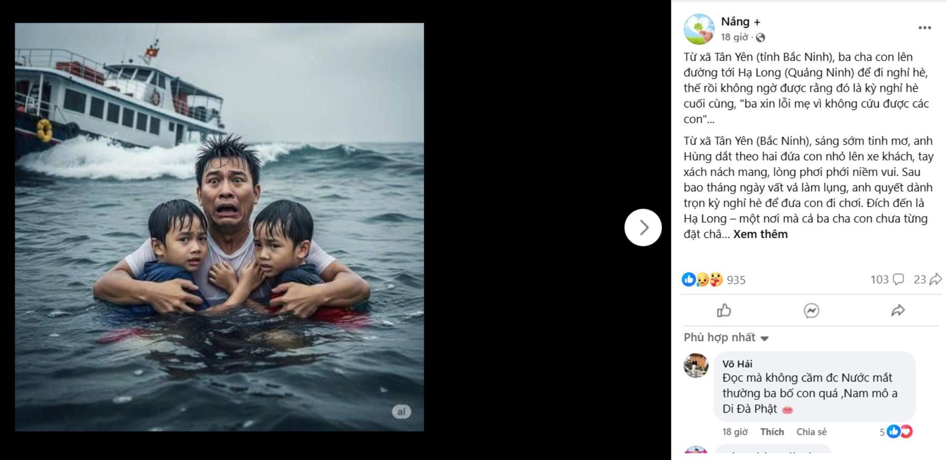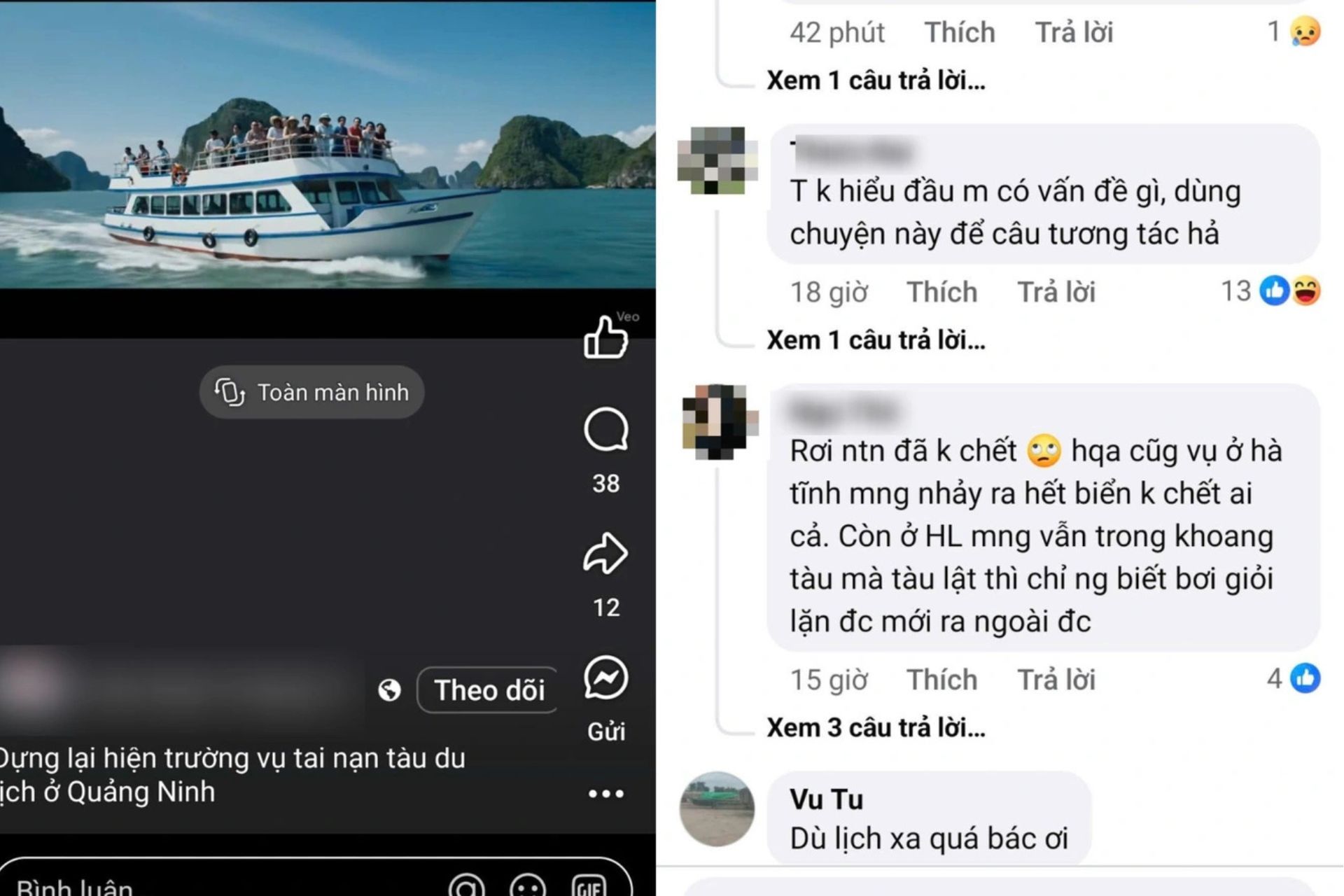 Một số tài khoản thậm chí còn sản xuất các video hoạt họa bằng AI, mô phỏng “hiện trường vụ tai nạn” với lời dẫn rùng rợn: “Khoảnh khắc cuối cùng trước khi tàu chìm ở Quảng Ninh”, khiến người xem dễ nhầm tưởng đó là clip do lực lượng cứu hộ ghi lại. Trong khi đó, những hình ảnh này hoặc được cắt ghép từ các vụ tai nạn khác, hoặc hoàn toàn do AI tạo ra, không liên quan gì tới sự kiện thực tế.