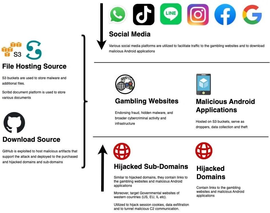 Theo các nhà nghiên cứu, hoạt động tội phạm này khởi đầu từ khoảng năm 2011, ban đầu là những trang cờ bạc trực tuyến vận hành thủ công. Tuy nhiên, sau nhiều năm, hệ thống này đã phát triển thành một mạng lưới đa tầng, gồm nhiều lớp hoạt động bổ trợ lẫn nhau như một dây chuyền hoàn chỉnh.