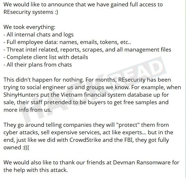 Theo ShinyHunters, nhóm đã “giành quyền truy cập toàn bộ” vào hệ thống nội bộ của Resecurity, thu thập được hàng loạt dữ liệu nhạy cảm như hồ sơ nhân viên, nhật ký trao đổi nội bộ, dữ liệu tình báo mối đe dọa, danh sách khách hàng và các tệp liên quan đến quản lý hoạt động an ninh mạng.