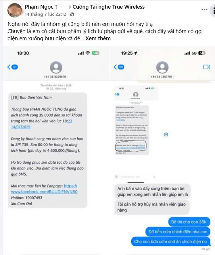 Giả danh nhân viên giao hàng, yêu cầu chuyển khoản phí: Trước đó, vào ngày 14/7, anh Phạm Ngọc T. (TP.HCM) cũng bị lừa khi một đối tượng tự xưng là nhân viên giao hàng của bưu cục gọi điện yêu cầu chuyển khoản 35.000 đồng để nhận bưu phẩm lý lịch tư pháp. Sau khi chuyển tiền, anh T. tiếp tục nhận tin nhắn yêu cầu "kích hoạt mã nhân viên" với giá 4,6 triệu đồng/tháng. Kẻ lừa đảo còn hướng dẫn anh T. vào đường link Facebook "Bưu điện Việt Nam" giả mạo để "giải quyết sự cố". Anh T. hoang mang nhận ra mình đã bị lừa.