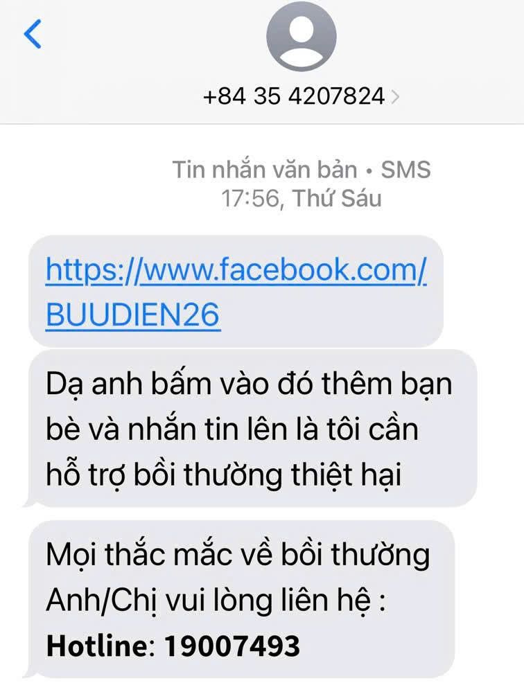 Điển hình là trường hợp của anh C. (Phường An Hội Đông, TP.HCM). Anh C. gửi bưu phẩm vào sáng 17/7. Đến 18 giờ ngày 18/7, anh nhận được cuộc gọi từ một người đàn ông tự xưng là nhân viên bảo hiểm hàng hóa của VNPost. Đối tượng này thông báo bưu phẩm của anh C. bị xe cán hư hỏng và muốn "thương lượng bồi thường". Kẻ gian còn gửi đường link "facebookBUUDIEN26" kèm lời nhắn "thêm bạn bè và nhắn tin tôi cần hỗ trợ bồi thường thiệt hại".