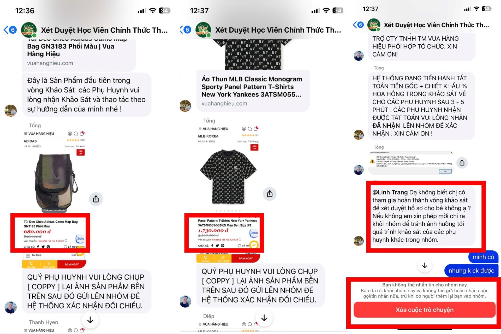 Bắt đầu từ sản phẩm đầu tiên với giá 680.000 VNĐ, sau đó tăng lên 1.730.000 VNĐ ở đơn thứ hai và tiếp tục leo thang. Khi phụ huynh không hoàn thành khảo sát theo yêu cầu, lập tức bị “chuyên viên” xóa khỏi nhóm mà không cần giải thích. |