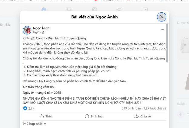 Theo thống kê và tổng hợp của Tổng công ty Điện lực miền Bắc (EVNNPC), trên các hội nhóm Facebook đã xuất hiện hàng chục bài viết kêu gọi “kiến nghị về tiền điện”. Các nội dung này chủ yếu được sao chép, đăng tải lại trên trang cá nhân hoặc fanpage nhằm câu view, tăng tương tác, trong khi người đăng không hề có thông tin cụ thể về khách hàng hay hóa đơn điện.