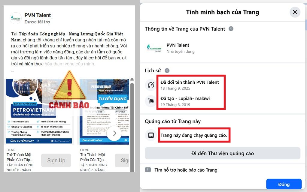 Các fanpage mạo danh sử dụng logo, hình ảnh và khẩu hiệu của Petrovietnam để tạo vỏ bọc chuyên nghiệp. Nổi bật là trang “PVN Talent”, đổi tên từ một tài khoản nước ngoài (Lupiah - malawi) hồi tháng 9/2025, gắn tick xanh và liên tục đăng quảng cáo tuyển dụng trên Facebook, Instagram. Nội dung thường nhấn mạnh “giá trị văn hóa Petrovietnam” nhưng thực chất không thuộc quyền quản lý của Tập đoàn.