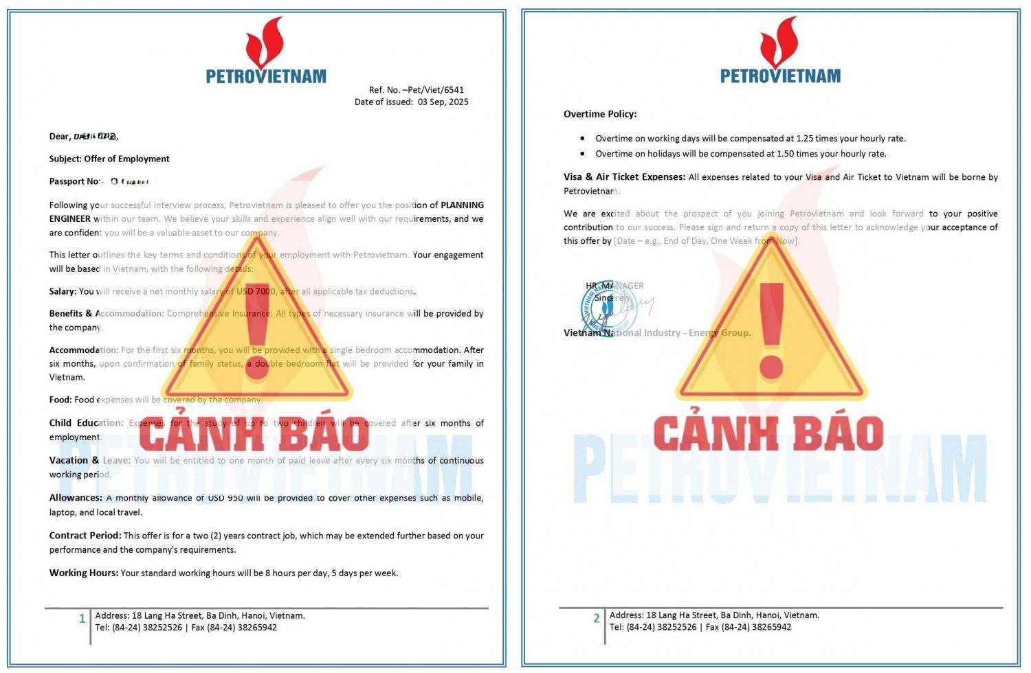 | “Thư mời làm việc” giả mạo Petrovietnam gửi đến cho các ứng viên người nước ngoài. Ảnh Petrotimes |
