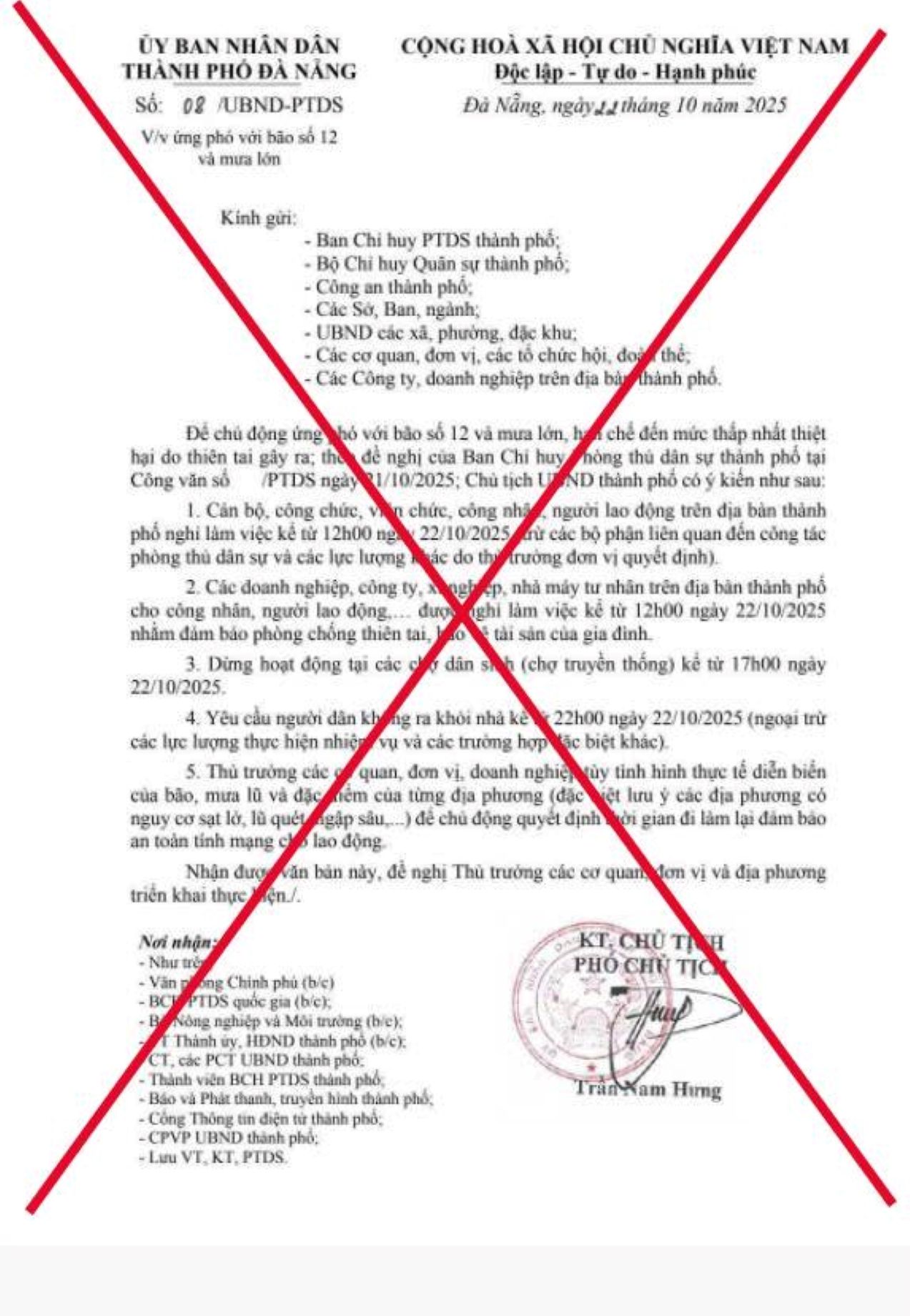 Trong ngày 22/10, trên mạng xã hội lan truyền hình ảnh một “văn bản chỉ đạo” mang danh UBND TP Đà Nẵng, nội dung cho rằng thành phố yêu cầu “toàn bộ cán bộ, công chức, viên chức, người lao động nghỉ làm việc từ 15h ngày 22/10; dừng hoạt động tất cả các chợ, trung tâm thương mại, siêu thị” để ứng phó với bão số 12 (Fengshen).