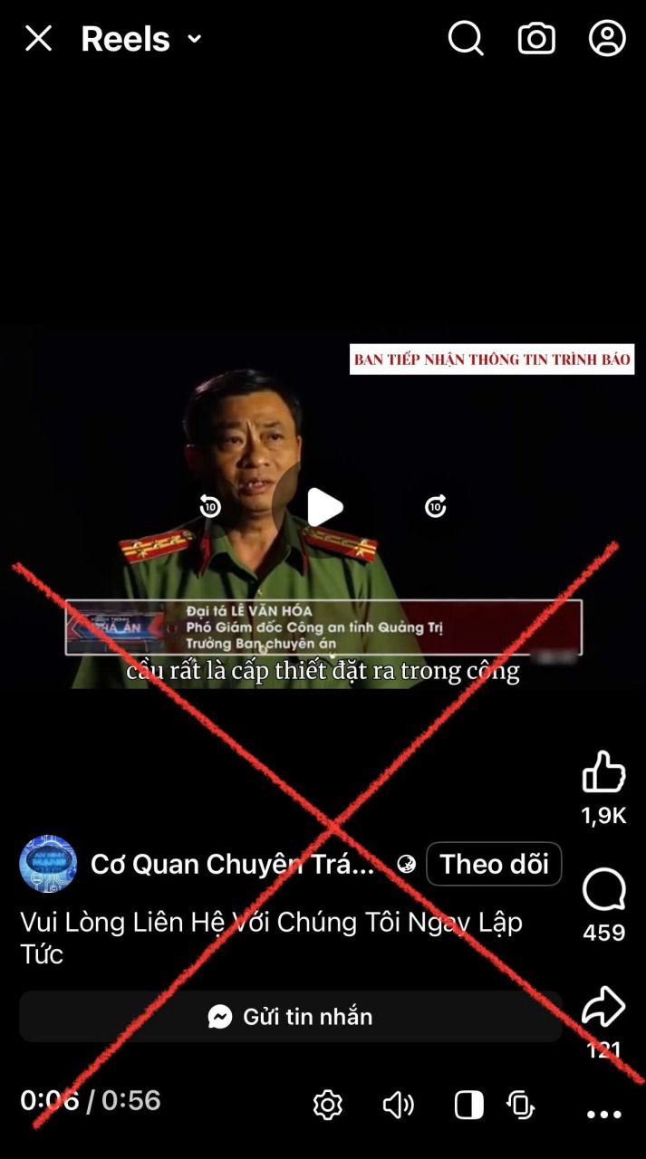 Thời gian gần đây, trên mạng xã hội Facebook xuất hiện một trang fanpage mang tên “Cơ Quan Chuyên Trách Khắc Phục Hậu Quả Tội Phạm Công Nghệ Cao BCA” - tự xưng là “đơn vị trực thuộc Bộ Công an”. Trang này đăng tải nhiều hình ảnh, video, đặc biệt là đoạn phỏng vấn Đại tá Lê Văn Hóa - Phó Giám đốc Công an tỉnh Quảng Trị, được cắt ghép từ phóng sự của kênh ANTV về chuyên án đấu tranh với tội phạm công nghệ cao trước đó.