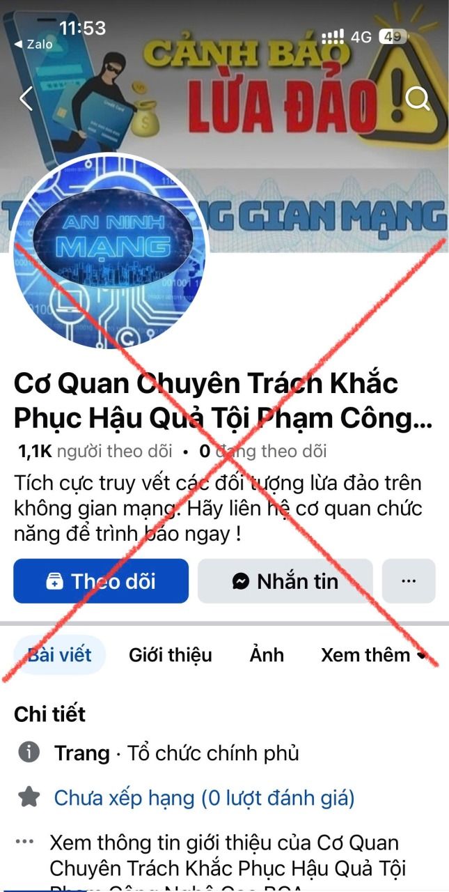 | Giao diện Fanpage mạo danh Bộ Công an, tự xưng có thể “giúp người dân lấy lại tiền bị lừa đảo”. |