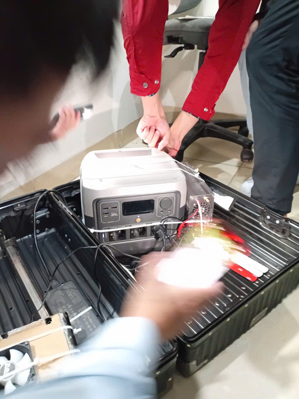 | Đối tượng người nước ngoài đang sử dụng thiết bị BTS giả mạo đặt trong vali, phát tán tin nhắn mạo danh Vietcombank để quảng cáo, lừa đảo. |