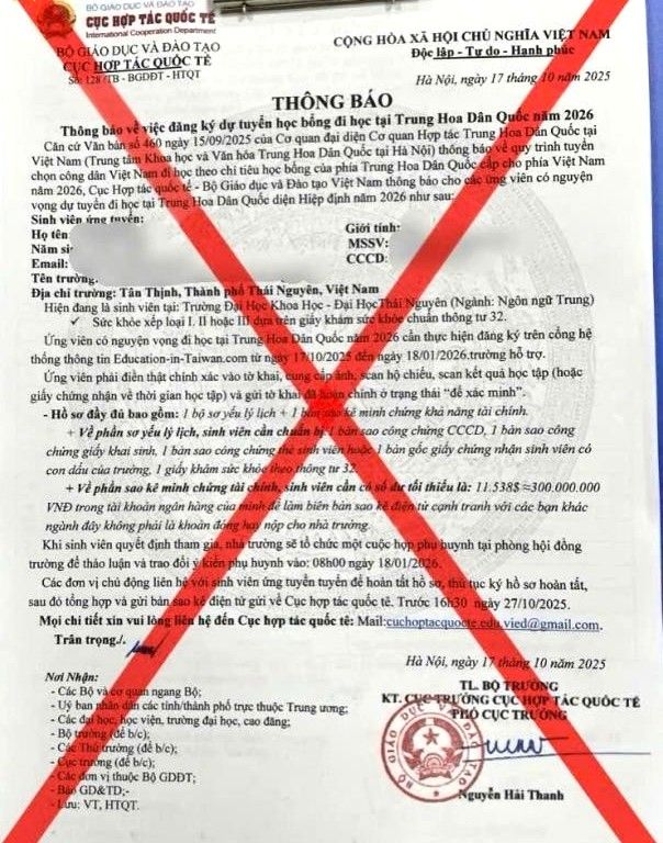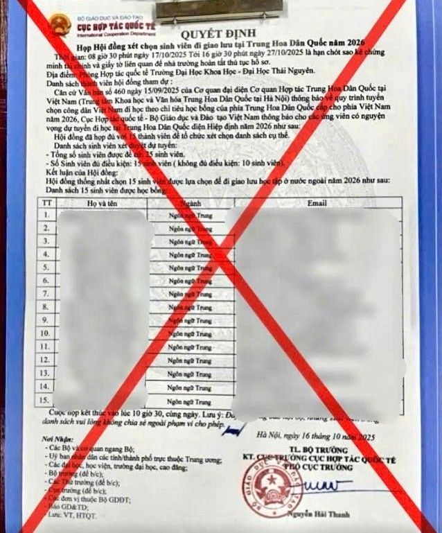Theo cơ quan chức năng, các đối tượng đã lan truyền thông tin giả mạo thông qua email, tin nhắn mạng xã hội, nhóm chat và các trang web có giao diện tương tự trang của cơ quan nhà nước. Đáng chú ý, chúng còn gửi kèm các “Thông báo dự tuyển”, “Quyết định họp Hội đồng xét chọn” được làm giả rất tinh vi, có gắn tên cơ quan, chữ ký và dấu đỏ giả, dễ khiến người nhận tin rằng đây là văn bản chính thức của Bộ Giáo dục và Đào tạo hoặc Cục Hợp tác quốc tế.