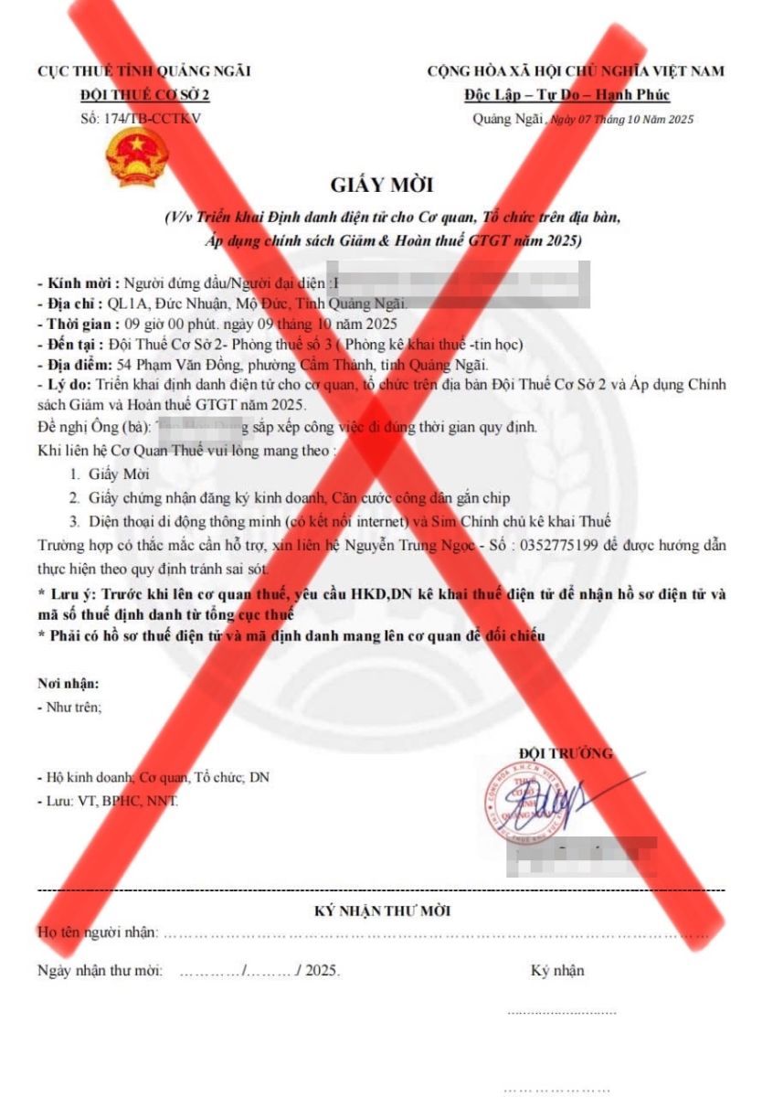 Theo phản ánh của các hộ kinh doanh, người dân nhận được giấy mời có hình thức giống hệt văn bản hành chính thật của ngành thuế, với nội dung “mời người dân/hộ kinh doanh đến trụ sở thực hiện thủ tục tích hợp định danh điện tử cho cơ quan, tổ chức và áp dụng chính sách giảm, hoàn thuế GTGT năm 2025”.