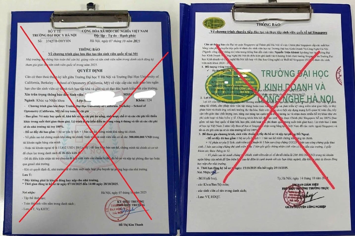 Khi sự việc tại trường Đại học Y vẫn chưa được làm rõ, tại Đại học Kinh doanh và Công nghệ Hà Nội cũng đã xuất hiện “Giấy báo trúng học bổng toàn phần du học Trung Quốc”. Văn bản được làm rất giống thật, từ cách trình bày đến con dấu và chữ ký, khiến người nhận tin rằng đây là thông báo chính thức của trường hoặc đối tác quốc tế của trường. Lợi dụng sự tin tưởng này, kẻ lừa đảo yêu cầu sinh viên đóng nhiều khoản phí như “phí bảo đảm”, “phí xét duyệt hồ sơ”, “phí đối tác”, tổng số tiền lên tới 300 triệu đồng.