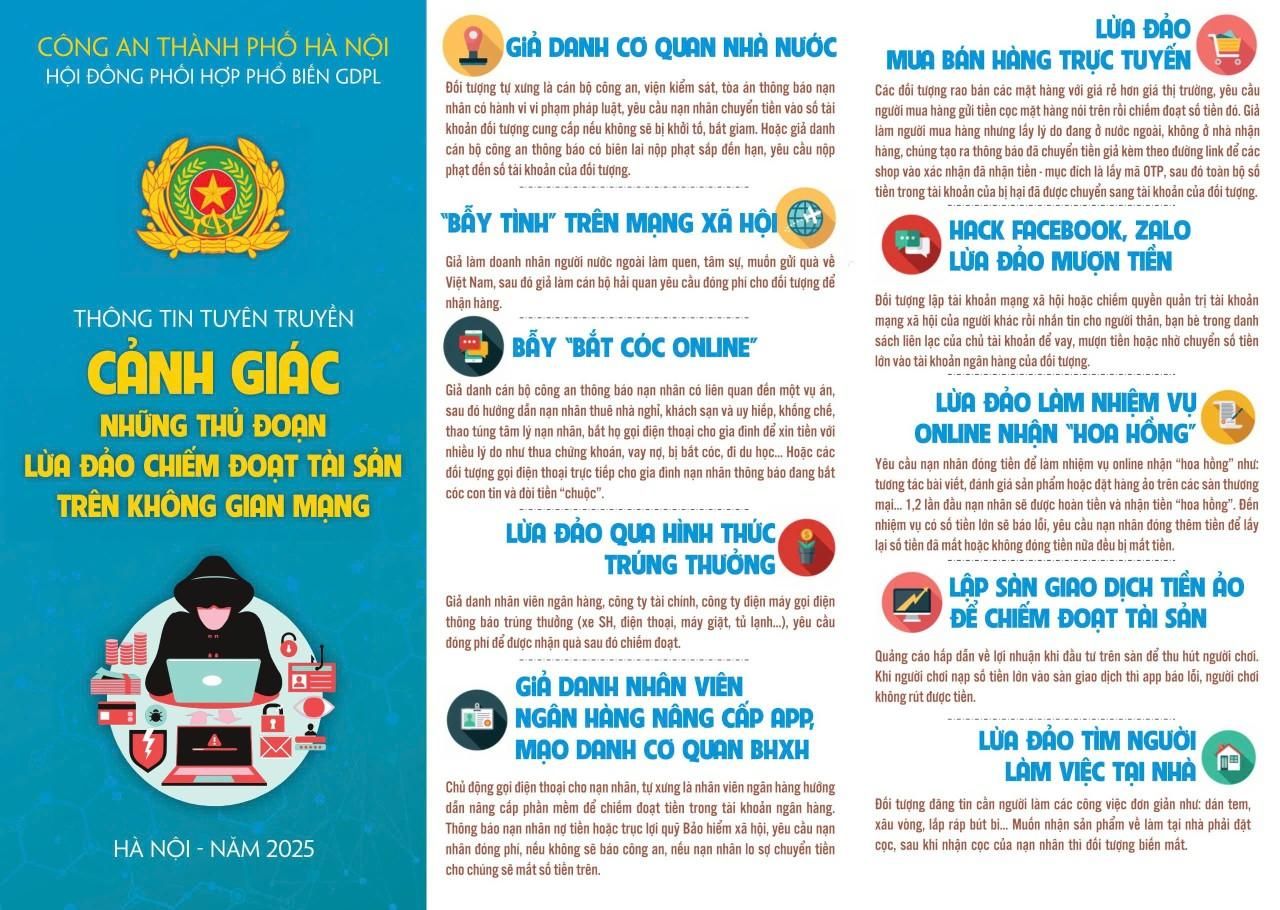 Công an thành phố Hà Nội vừa tuyên truyền, cảnh báo người dân tăng cường cảnh giác trước các thủ đoạn lừa đảo chiếm đoạt tài sản trên không gian mạng. Cơ quan công an cũng hướng dẫn các biện pháp phòng ngừa, giúp người dân bảo vệ tài khoản, thông tin cá nhân và tránh trở thành nạn nhân của các chiêu trò gian lận trực tuyến.