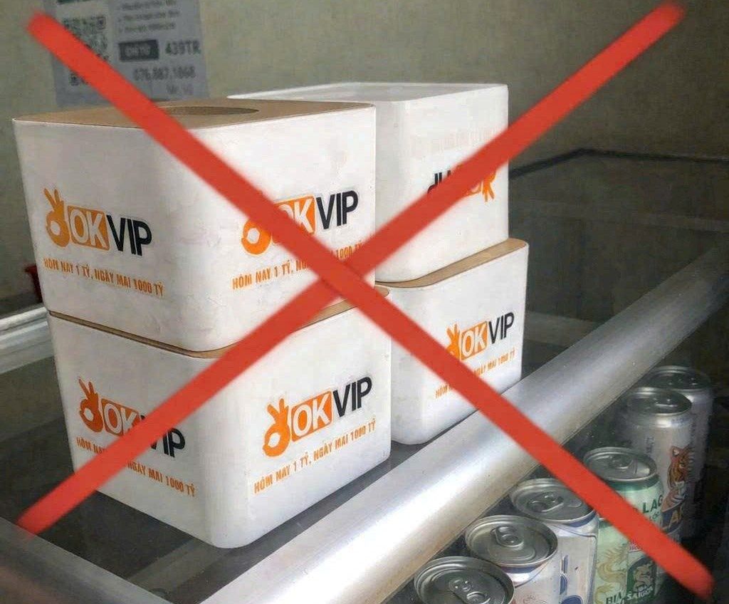 | Một số hình ảnh có gắn tên miền, mã QR, logo quảng cáo các trang web cá độ, cờ bạc trực tuyến trên bảng hiệu, hộp tăm, hộp đựng khăn giấy, ấn phẩm. |