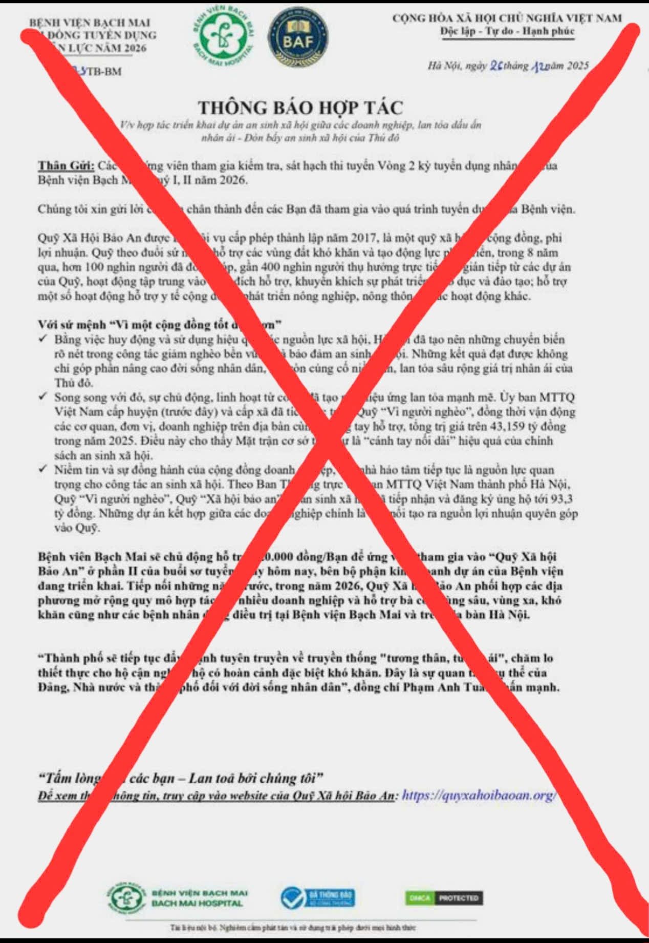 Theo Bệnh viện Bạch Mai, thời gian gần đây đã xuất hiện nhiều trường hợp đối tượng lừa đảo lợi dụng danh nghĩa bệnh viện để tiếp cận học viên và ứng viên tham gia kỳ tuyển dụng năm 2026. Các đối tượng sử dụng hình ảnh, logo, văn bản mang tên “thông báo hợp tác”, “quỹ xã hội” hay “hỗ trợ ứng viên” để tạo lòng tin và tiếp cận nạn nhân.