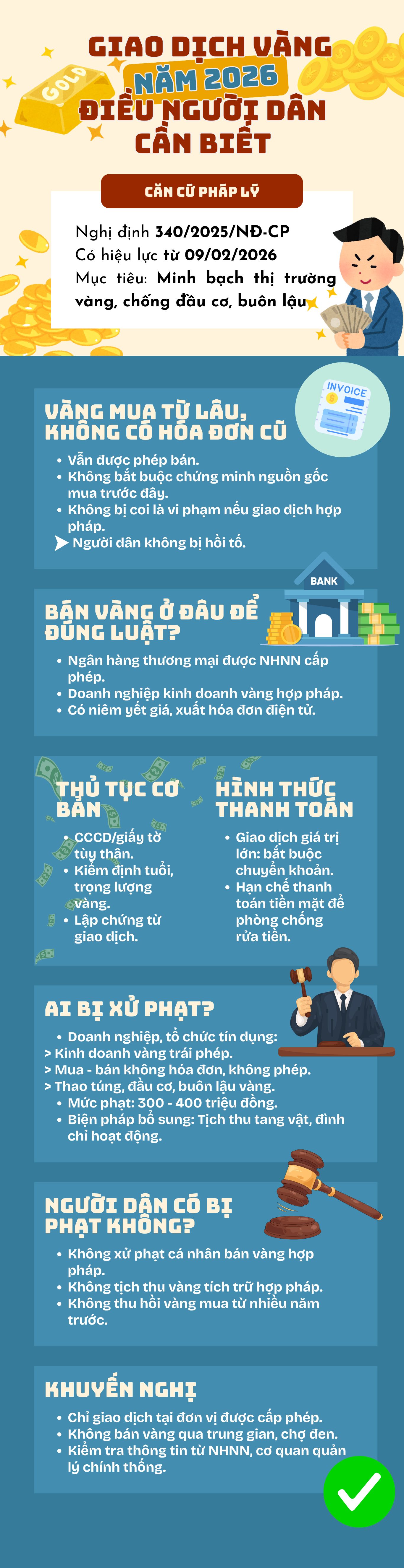Do đó, người dân nên mua bán vàng tại các tổ chức được Ngân hàng Nhà nước cấp phép, yêu cầu hóa đơn, chứng từ đầy đủ, thực hiện thanh toán qua tài khoản ngân hàng, tránh giao dịch “trao tay”, tự phát hoặc qua các kênh môi giới trên mạng xã hội. Việc tuân thủ đúng quy trình pháp lý không chỉ giúp người dân tránh bị xử phạt mà còn bảo đảm an toàn tài sản và hạn chế nguy cơ bị lừa đảo.