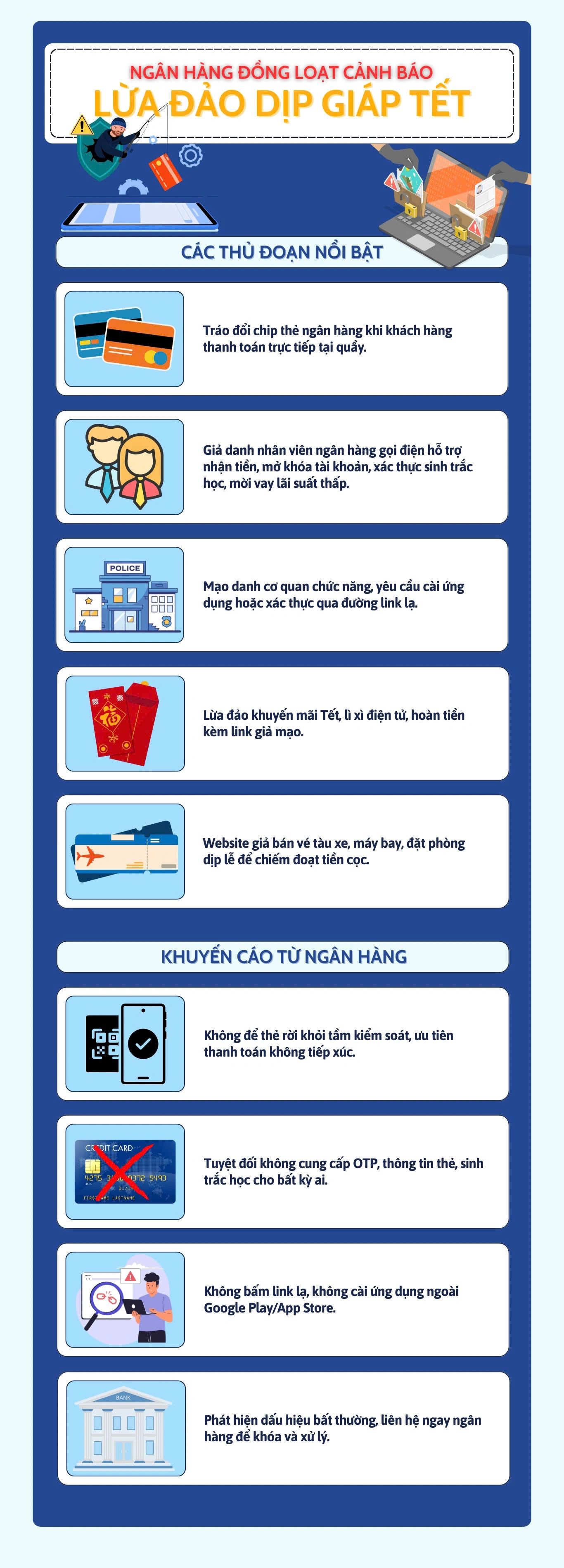 Trước thực trạng này, các ngân hàng khuyến cáo người dân cần nâng cao cảnh giác trong mọi giao dịch tài chính dịp cuối năm: không truy cập các đường link lạ được gửi qua tin nhắn, email hay mạng xã hội; tuyệt đối không cung cấp thông tin thẻ, mã OTP hoặc thực hiện sinh trắc học theo yêu cầu từ các cuộc gọi không xác thực; không cài đặt ứng dụng từ nguồn không chính thống và hạn chế sử dụng mạng wifi công cộng khi giao dịch tài chính.
