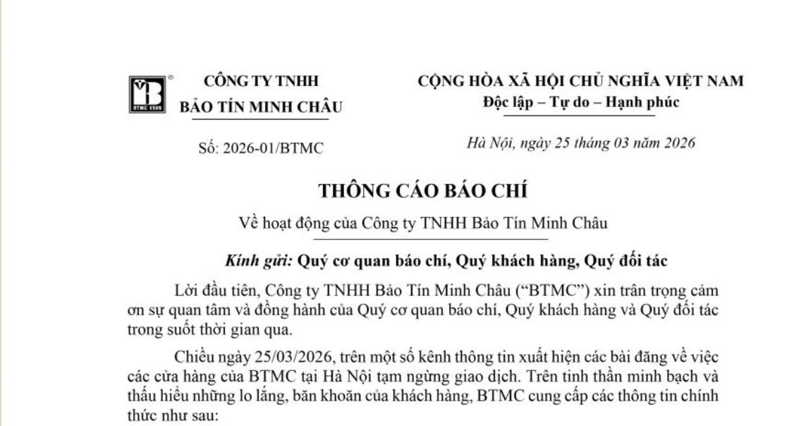 Trước diễn biến này, đêm ngày 25/3, Bảo Tín Minh Châu đã phát đi thông cáo báo chí nhằm làm rõ sự việc. Theo đơn vị này, việc tạm dừng giao dịch tại một số cửa hàng trong chiều 25/3 là để phối hợp với cơ quan chức năng trong quá trình xác minh, làm rõ một số thông tin.