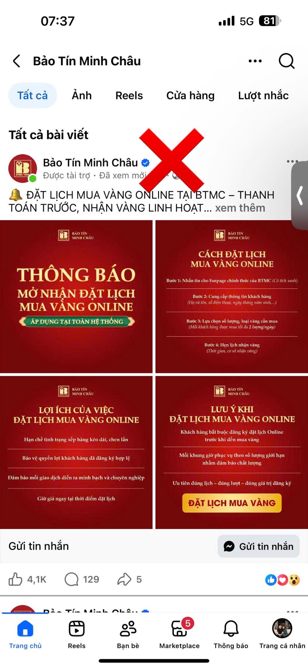 Thời gian gần đây, một tài khoản có tích xanh Bảo Tín Minh Châu đã đăng tải thông tin về việc đặt mua vàng online tại doanh nghiệp này. Tuy nhiên, trên website cũng như Facebook chính thức của Bảo Tín Minh Châu chưa từng có thông báo về hình thức giao dịch trực tuyến này. Người dân nên thận trọng với các thông tin chưa được kiểm chứng, đặc biệt là các lời mời chào giao dịch nhanh, giá tốt hoặc “đặt lịch online” bất thường. Chỉ nên tìm hiểu thông tin từ kênh chính thức và cân nhắc kỹ trước khi chuyển tiền để tránh rủi ro không đáng có.