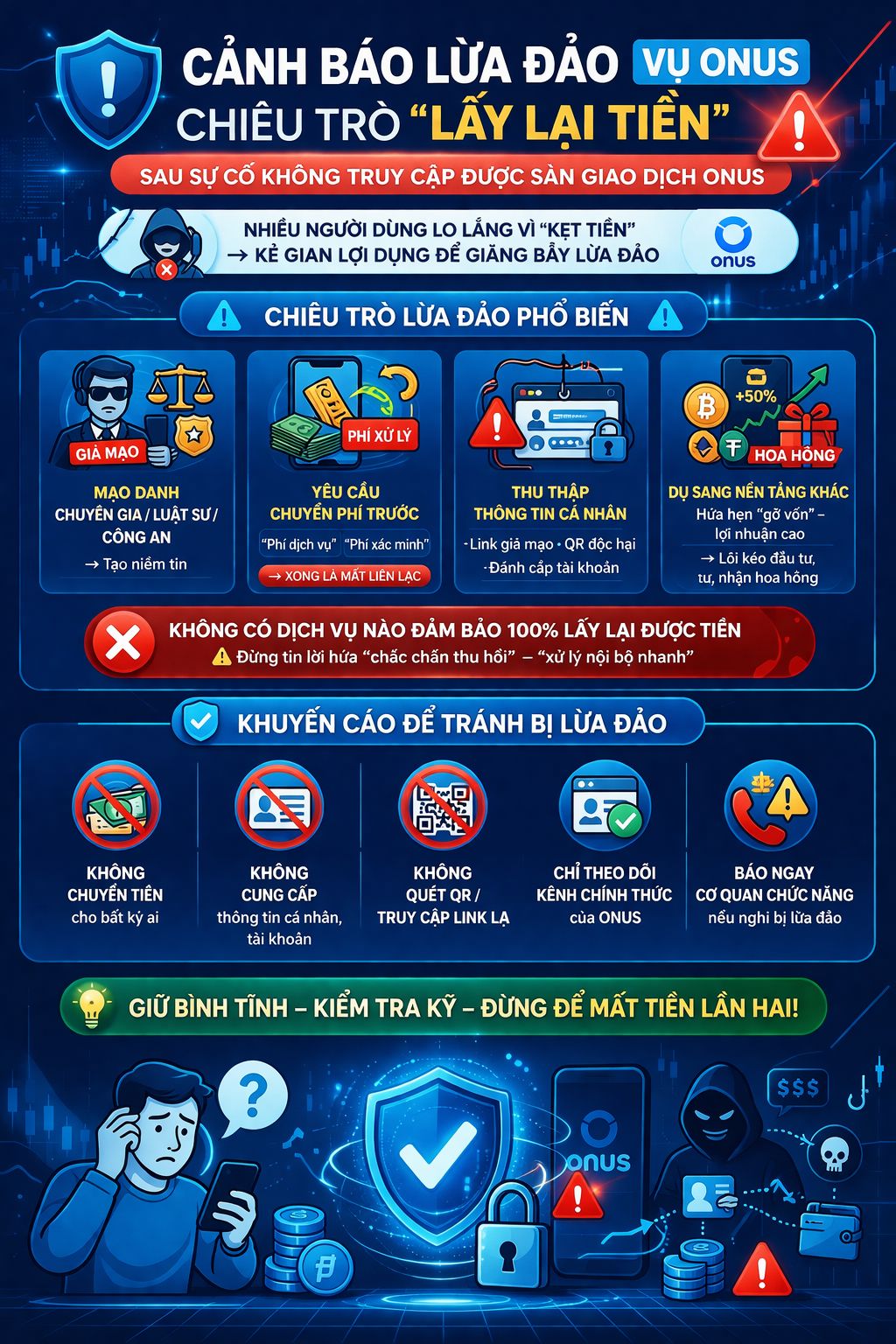 Trong bối cảnh thông tin về sự cố Onus chưa được làm rõ, người dùng được khuyến cáo giữ bình tĩnh, không chuyển tiền cho bất kỳ cá nhân hay tổ chức không rõ danh tính, không cung cấp thông tin nhạy cảm và chỉ theo dõi thông báo từ các kênh chính thức. Khi phát hiện dấu hiệu lừa đảo, cần nhanh chóng trình báo cơ quan chức năng để được hỗ trợ kịp thời.