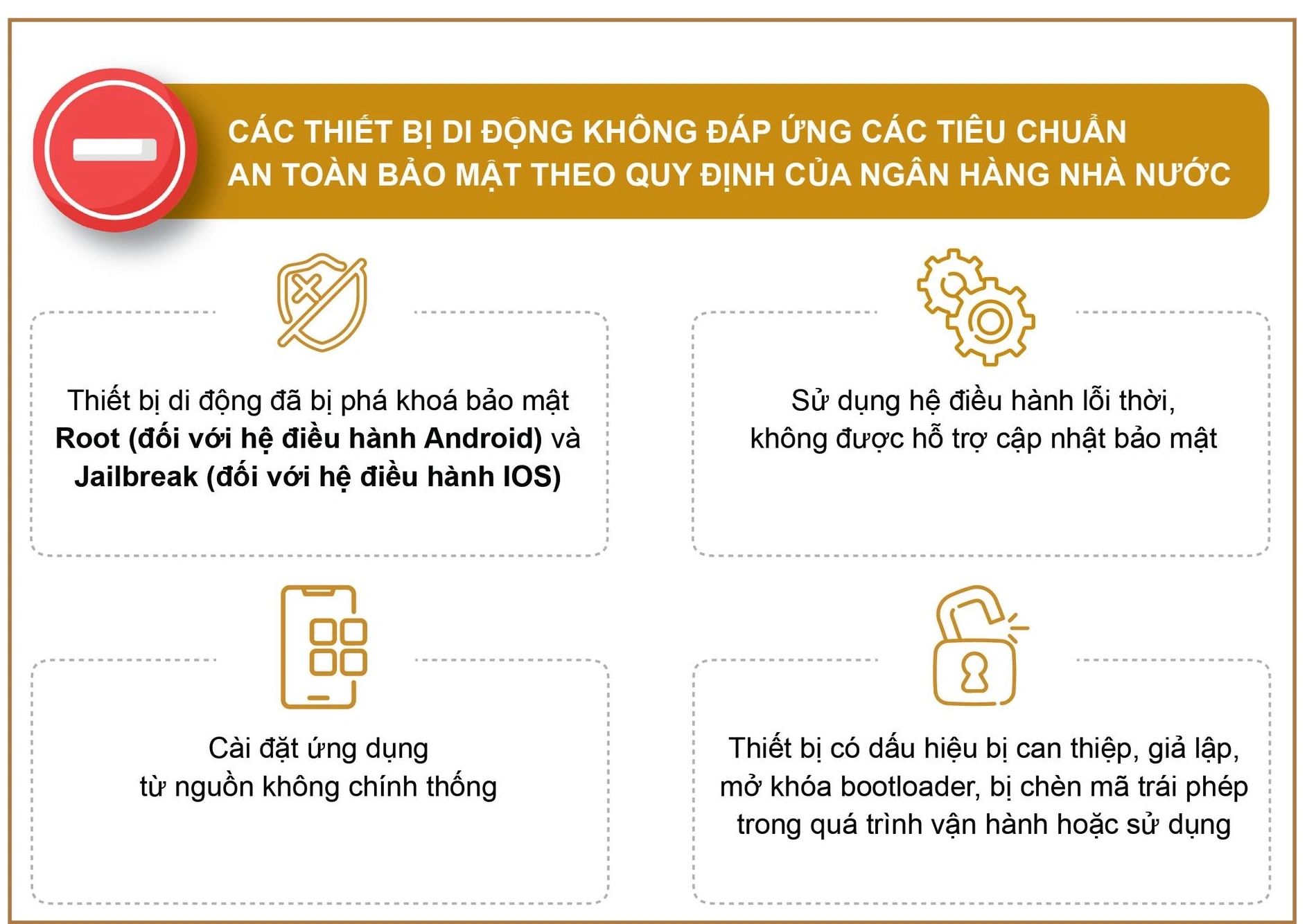 Các thiết bị di động khách hàng sẽ bị từ chối truy cập nếu thuộc một trong các trường hợp:Đã bị root hoặc jailbreak; Sử dụng hệ điều hành lỗi thời, không còn bản vá bảo mật; Cài đặt ứng dụng từ nguồn không chính thống; Có dấu hiệu bị can thiệp, mở khóa bootloader hoặc chèn mã trái phép