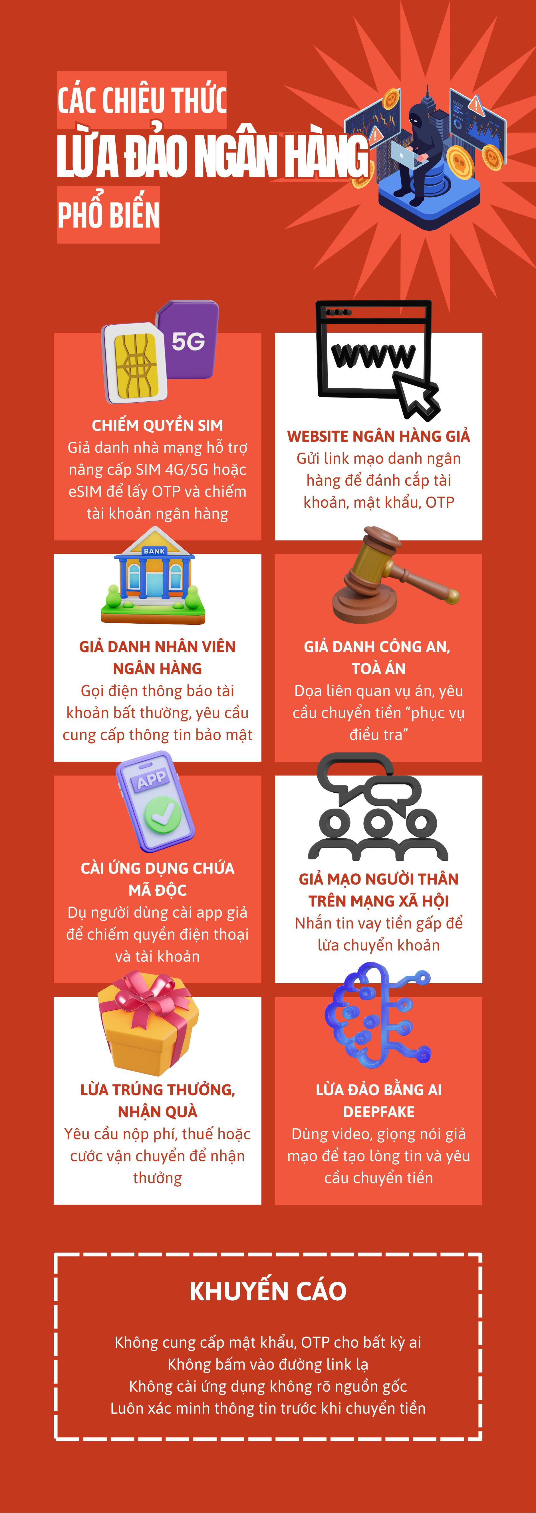 Một chiêu trò khác cũng rất phổ biến là mạo danh nhân viên ngân hàng để tiếp cận khách hàng. Các đối tượng thường gọi điện hoặc gửi tin nhắn với nhiều kịch bản khác nhau như thông báo tài khoản có giao dịch bất thường, hỗ trợ vay vốn trực tuyến, tư vấn đầu tư hoặc thông báo trúng thưởng chương trình khuyến mại. Sau khi tạo được lòng tin, kẻ gian sẽ yêu cầu khách hàng cung cấp thông tin thẻ, mật khẩu đăng nhập, mã OTP hoặc chuyển một khoản tiền để hoàn tất thủ tục. Trên thực tế, các ngân hàng không bao giờ yêu cầu khách hàng cung cấp thông tin bảo mật qua điện thoại hay tin nhắn.