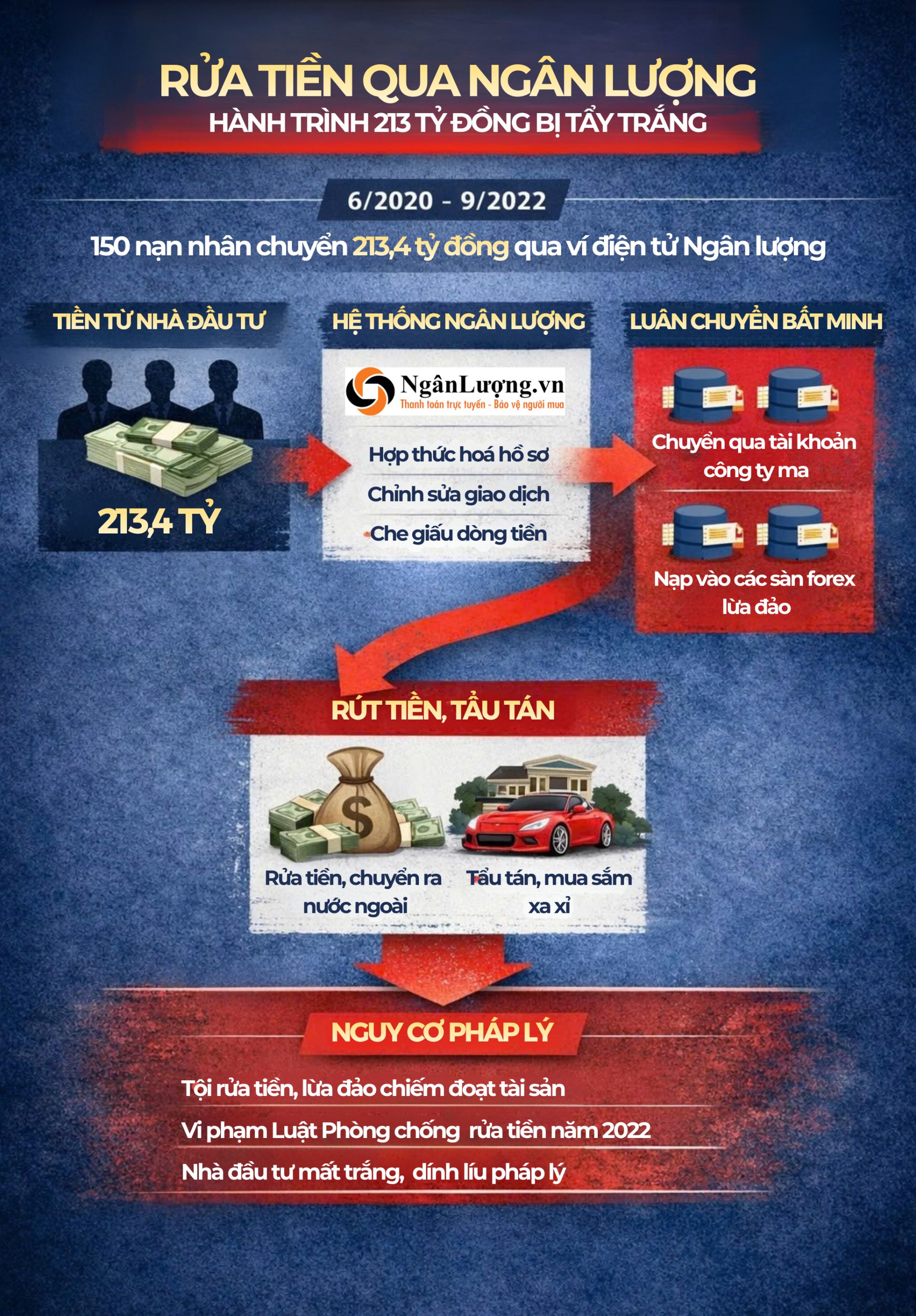Từ 15/6/2020 đến 23/9/2022, 150 nạn nhân đã chuyển tổng cộng hơn 213,4 tỷ đồng vào các tài khoản ví Ngân Lượng, dòng tiền này sau đó được luân chuyển qua nhiều tài khoản ngân hàng đứng tên công ty trước khi nạp vào các sàn forex trái phép.