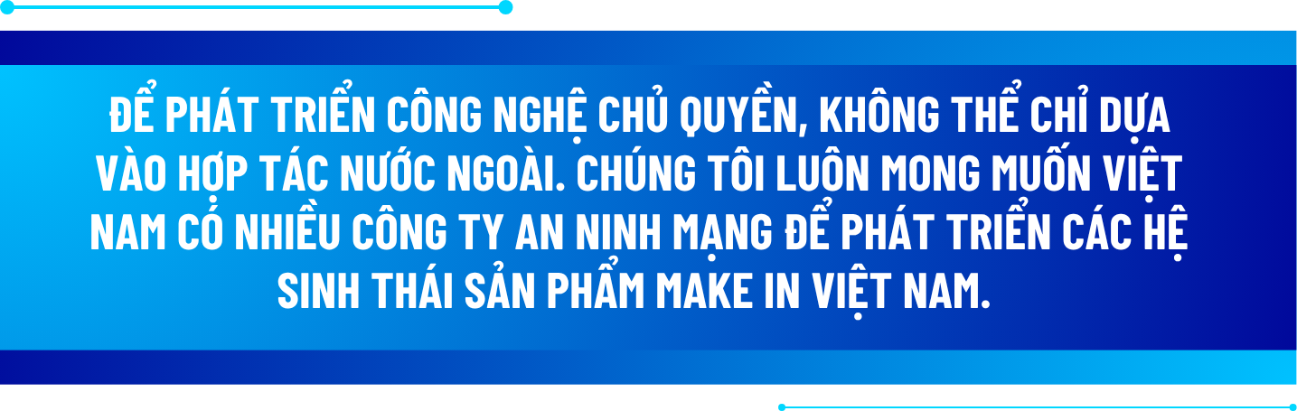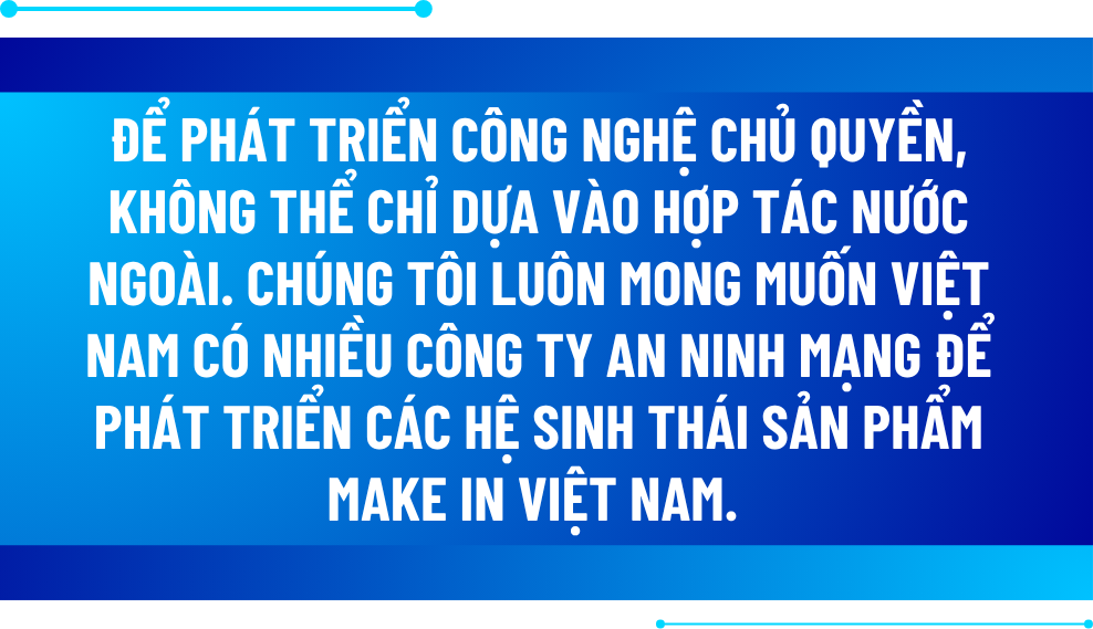 Chúng ta có thể chia nhau ra để phát triển, mỗi công ty tập trung vào các sản phẩm thế mạnh của mình. Hợp tác với nhau để hệ sinh thái của các công ty có thể kết nối bổ sung cho nhau. Từ đó chúng ta có một hệ sinh thái lớn hơn, hệ sinh thái an ninh mạng Việt Nam. Từ đó cùng nhau đưa các sản phẩm này ra xuất khẩu, bán ở thị trường nước ngoài. Đây cũng là mục tiêu mà Hiệp hội An ninh mạng quốc gia đang theo đuổi: phát triển một nền công nghiệp an ninh mạng với sự tham gia của nhiều doanh nghiệp Việt Nam, tạo ra các sản phẩm đẳng cấp quốc tế. Dù con đường phía trước còn rất dài, nhưng đó là mục tiêu rõ ràng mà chúng tôi hướng tới.