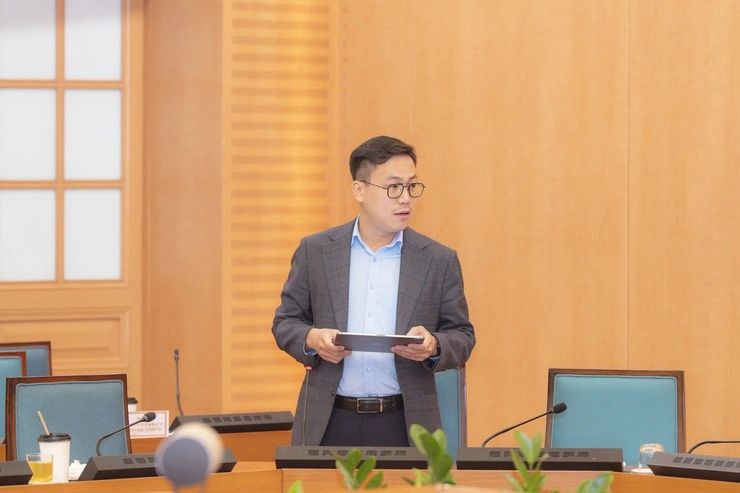 | Phó Giám đốc Trung tâm Truyền thông, Dữ liệu và Công nghệ số, Văn phòng UBND thành phố Hà Nội Nguyễn Đức Thuận báo cáo tại cuộc họp. |