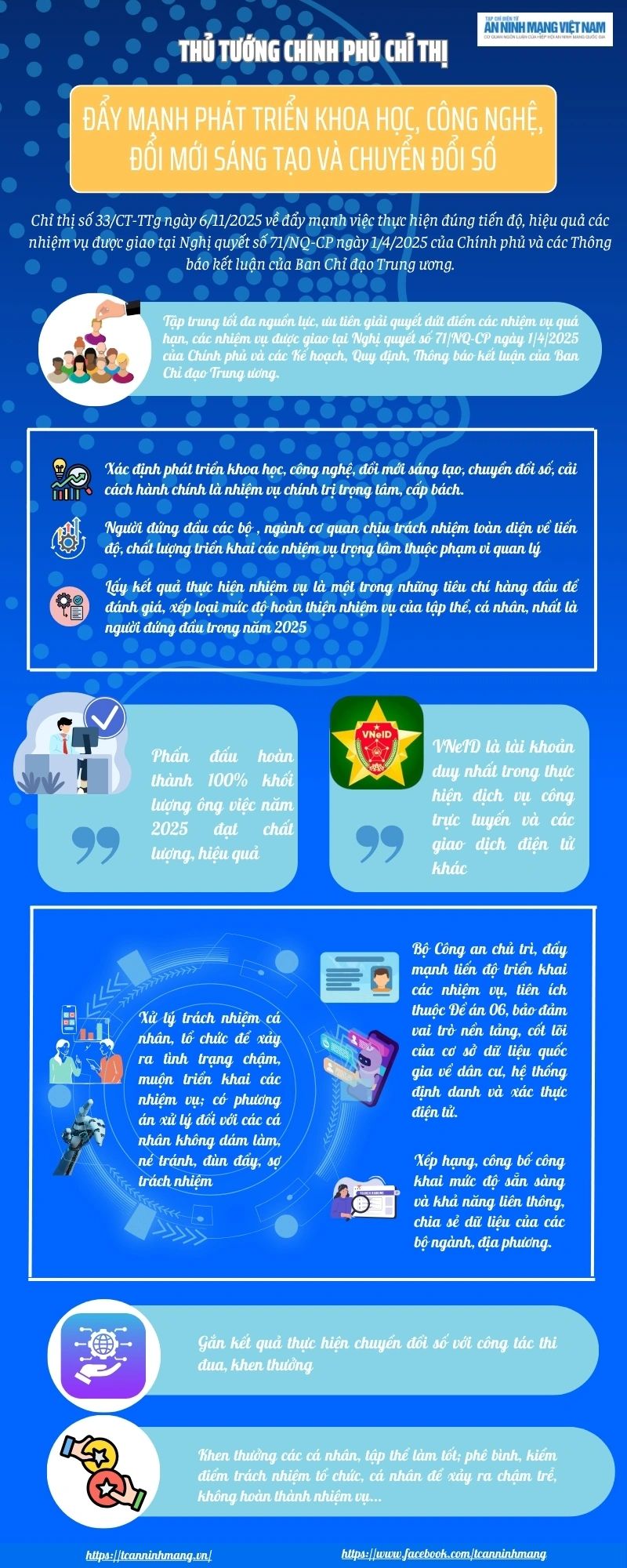 Thủ tướng Chính phủ Phạm Minh Chính yêu cầu các bộ, ngành, địa phương tập trung tối đa nguồn lực, ưu tiên xử lý dứt điểm những nhiệm vụ quá hạn theo Nghị quyết 71/NQ-CP và các kết luận của Ban Chỉ đạo Trung ương. Việc phát triển khoa học công nghệ, đổi mới sáng tạo, cải cách hành chính và chuyển đổi số phải được coi là nhiệm vụ chính trị trọng tâm, cấp bách; gắn trực tiếp với đánh giá mức độ hoàn thành nhiệm vụ của tập thể và người đứng đầu trong năm 2025.