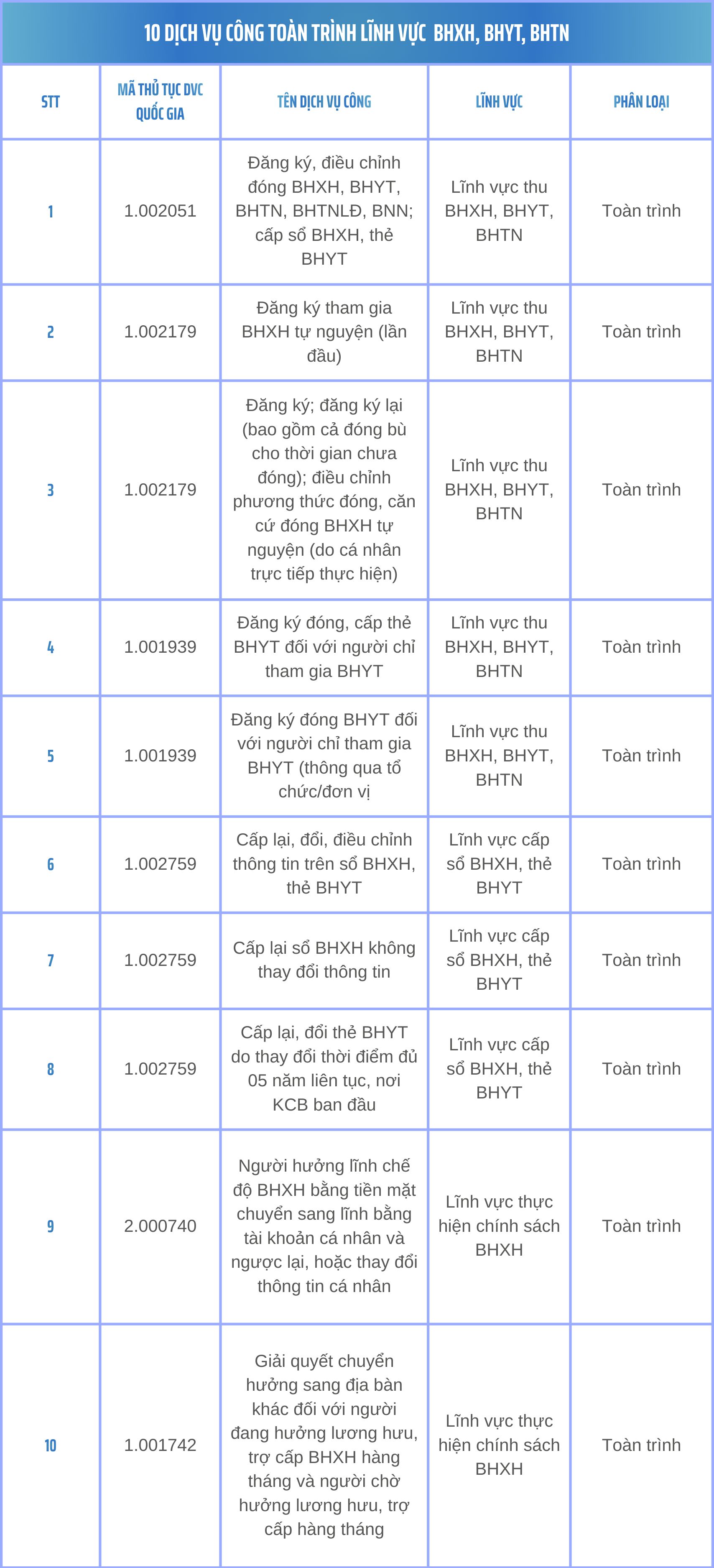 | 10 dịch vụ công toàn trình lĩnh vực BHXH, BHYT, BHTN. |