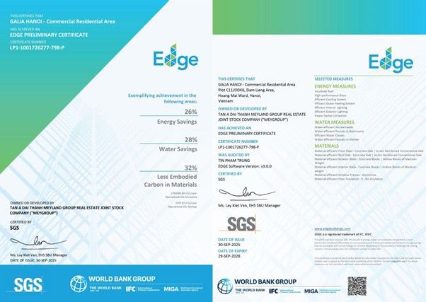 Nằm trong khuôn khổ Tuần lễ Công trình xanh và Giao thông xanh Việt Nam năm 2025 do Bộ Xây dựng chủ trì, tổ hợp căn hộ hạng sang Galia Hanoi vừa được Tổ chức Tài chính Quốc tế (IFC), thành viên Nhóm Ngân hàng Thế giới, trao chứng nhận công trình xanh EDGE. Đây là chứng nhận quốc tế được công nhận trên hơn 100 quốc gia, ghi nhận các công trình đạt hiệu quả sử dụng năng lượng, nước và vật liệu xây dựng so với tiêu chuẩn thông thường.