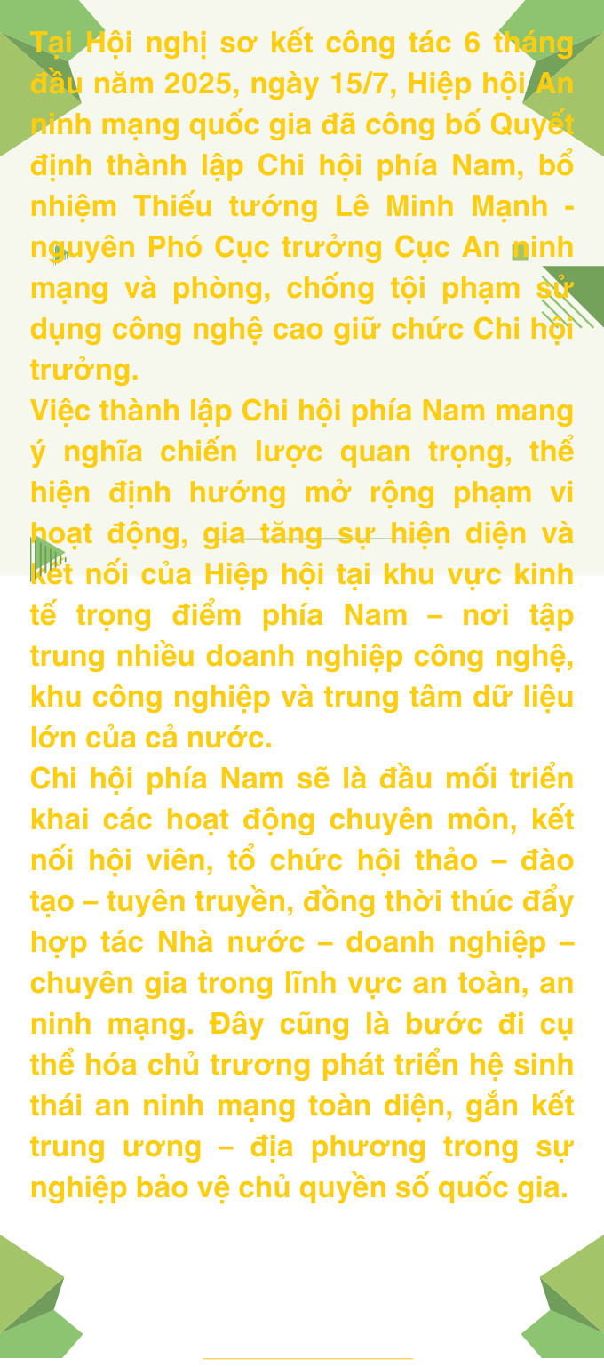 Trong bối cảnh chuyển đổi số quốc gia đang bước vào giai đoạn tăng tốc, an ninh mạng không chỉ là tuyến phòng thủ chiến lược mà còn là nền tảng kiến tạo niềm tin số – yếu tố cốt lõi để bảo vệ chủ quyền, phát triển kinh tế số và củng cố niềm tin xã hội. Nhận thức rõ điều đó, thời gian qua, Hiệp hội An ninh mạng quốc gia đã không ngừng mở rộng mạng lưới, nâng cao chất lượng hoạt động các Chi hội, thúc đẩy hợp tác đa ngành và đồng hành cùng hệ thống chính trị trong việc bảo vệ không gian mạng Việt Nam.