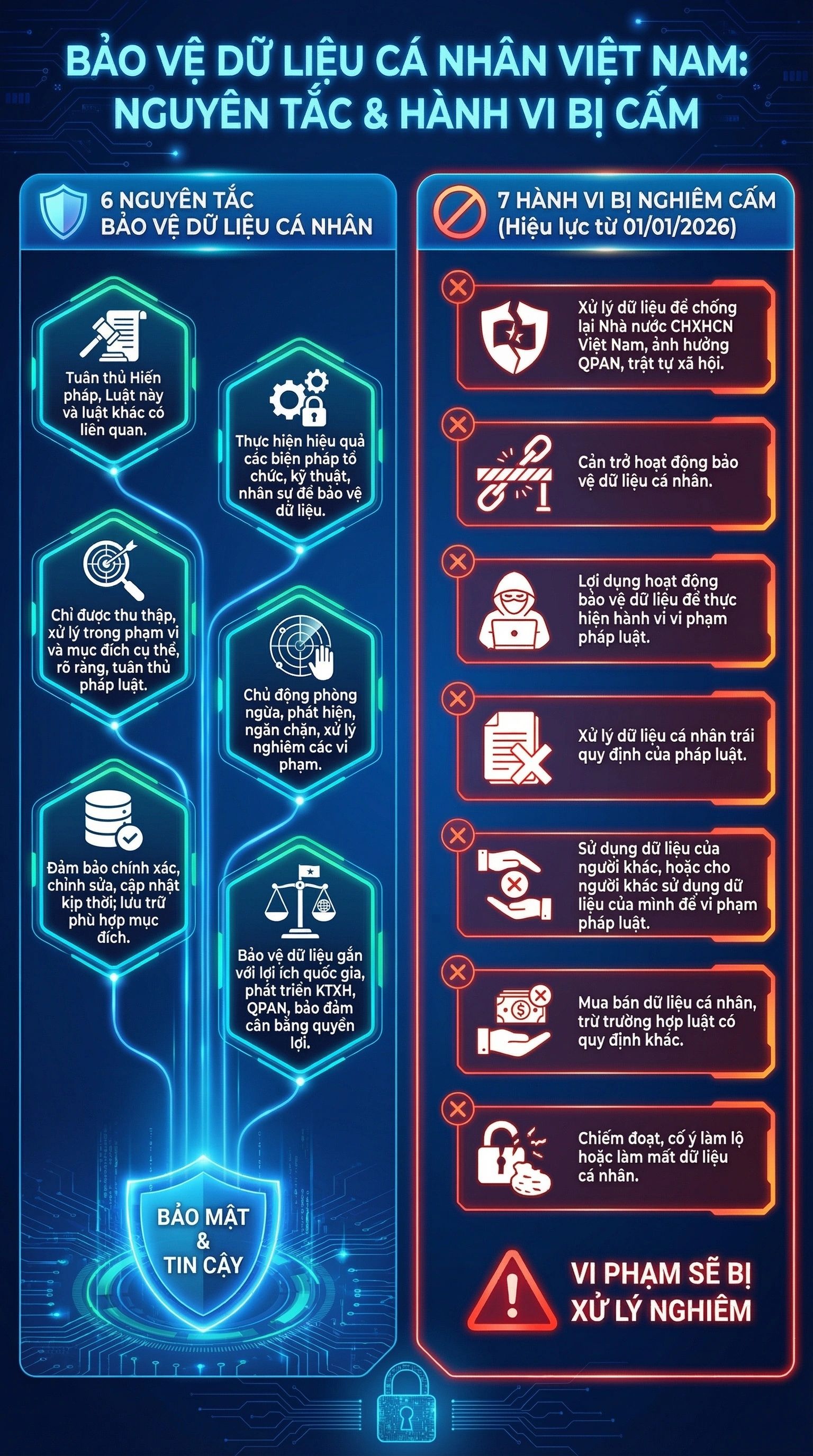 Từ 1/1/2026, khi Luật Bảo vệ Dữ liệu cá nhân có hiệu lực, một số hành vi sau đây là vi phạm và người thực thi hành vi sẽ phải chiụ trách nhiệm trước pháp luật. Bên cạnh đó, chuyên gia cũng khuyến cáo 6 nguyên tắc để bảo vệ dữ liệu cá nhân.