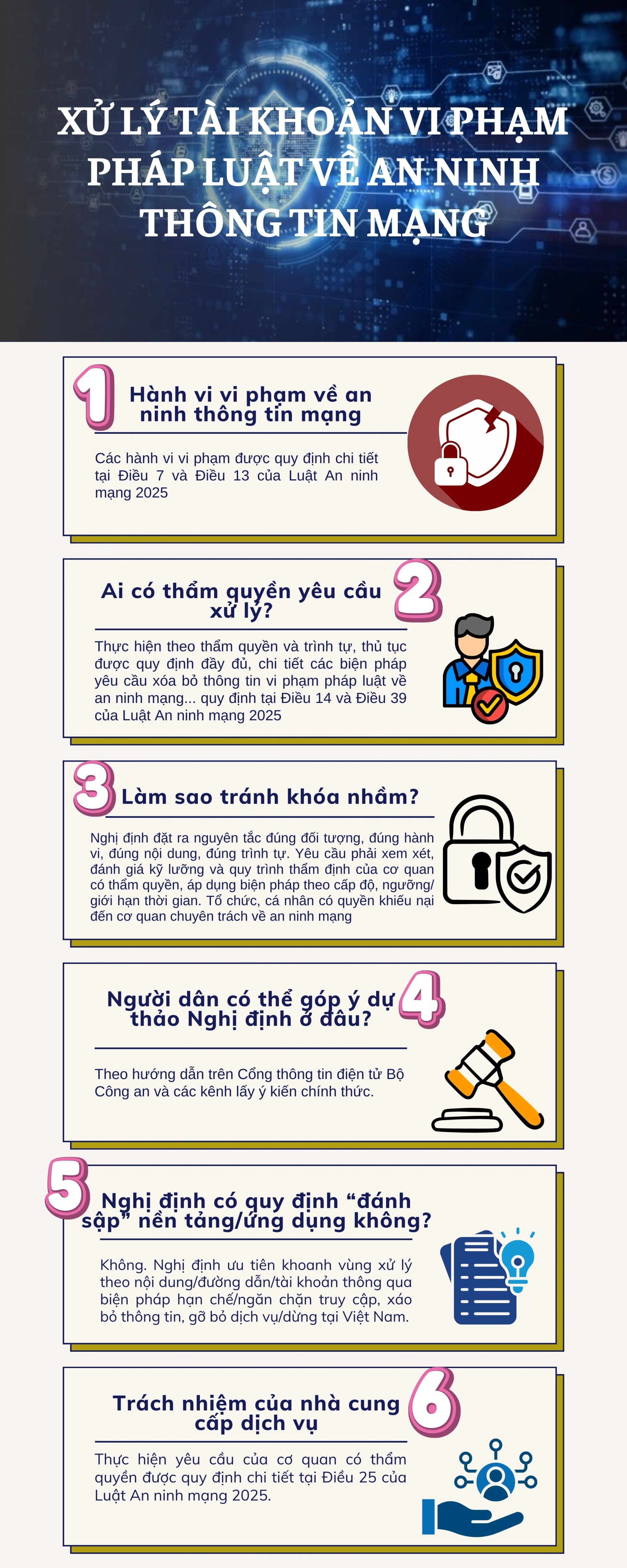 Các hành vi vi phạm về an ninh thông tin mạng được xác định cụ thể tại Điều 7 và Điều 13 của Luật An ninh mạng 2025. Đây là cơ sở pháp lý để cơ quan chức năng phát hiện và xử lý các tài khoản đăng tải nội dung vi phạm trên không gian mạng.