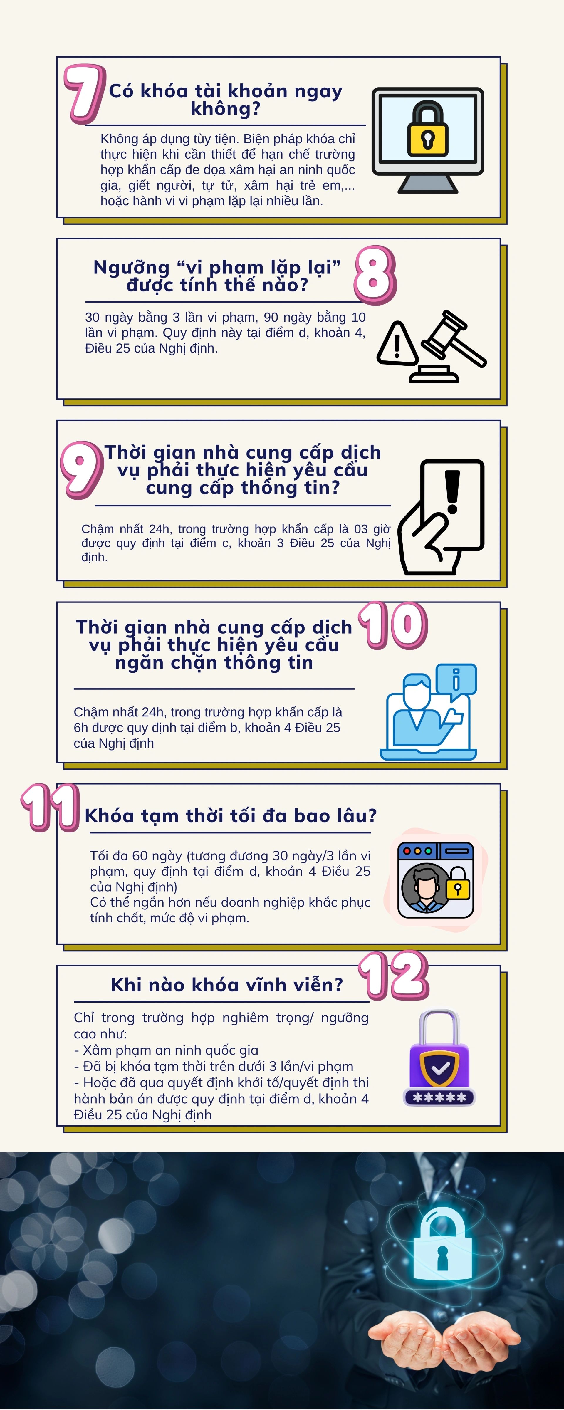 Đối với các tài khoản có dấu hiệu vi phạm nhiều lần, cơ quan chức năng có thể yêu cầu khóa tạm thời tài khoản nhằm ngăn chặn việc tiếp tục phát tán nội dung vi phạm. Thời gian khóa tạm thời tối đa 60 ngày, tương đương khoảng 30 ngày đối với mỗi lần vi phạm.