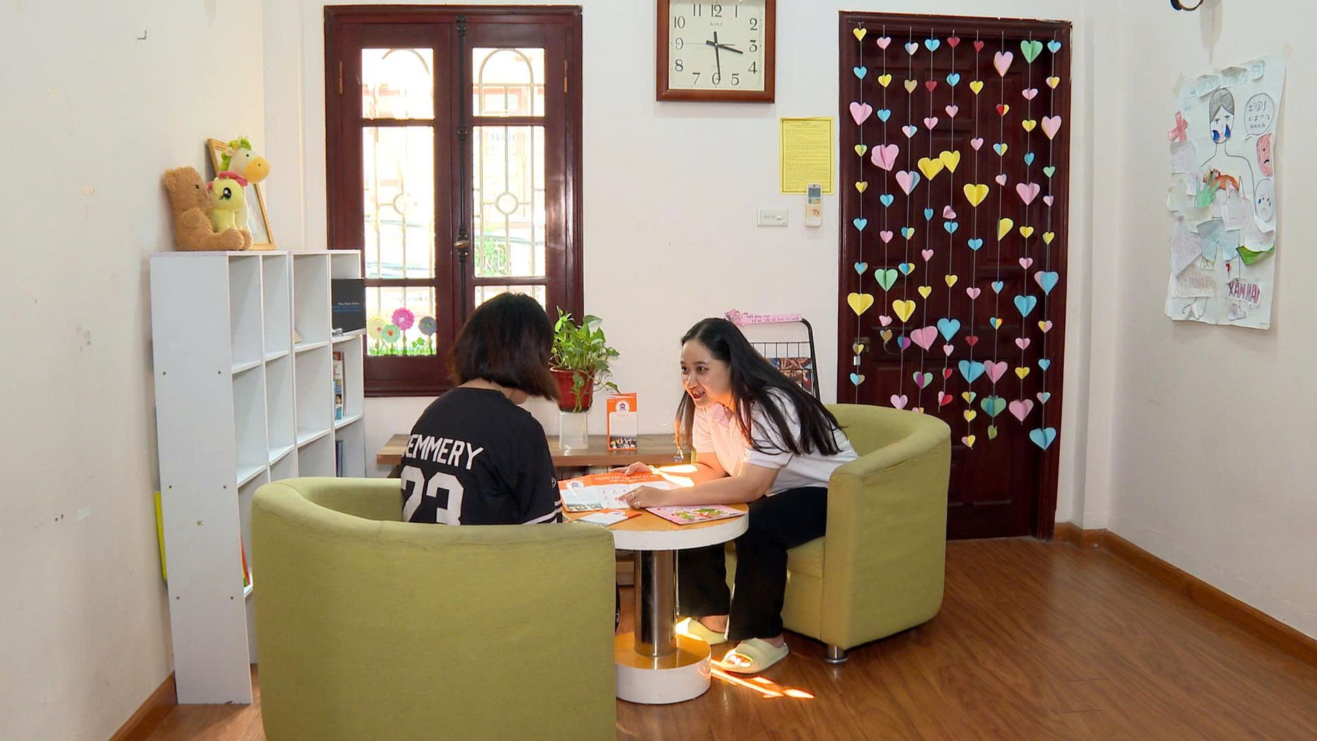 | Nhân viên của Ngôi nhà Bình yên đang trò chuyện, hỗ trợ nạn nhân mua bán người. |