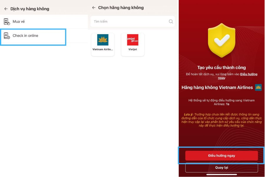 Bước 5: Sau khi hệ thống sẽ hiển thị màn hình tạo yêu cầu thành công, người dân chọn "Điều hướng ngay" để chuyển sang ứng dụng của hãng hàng không đã lựa chọn.