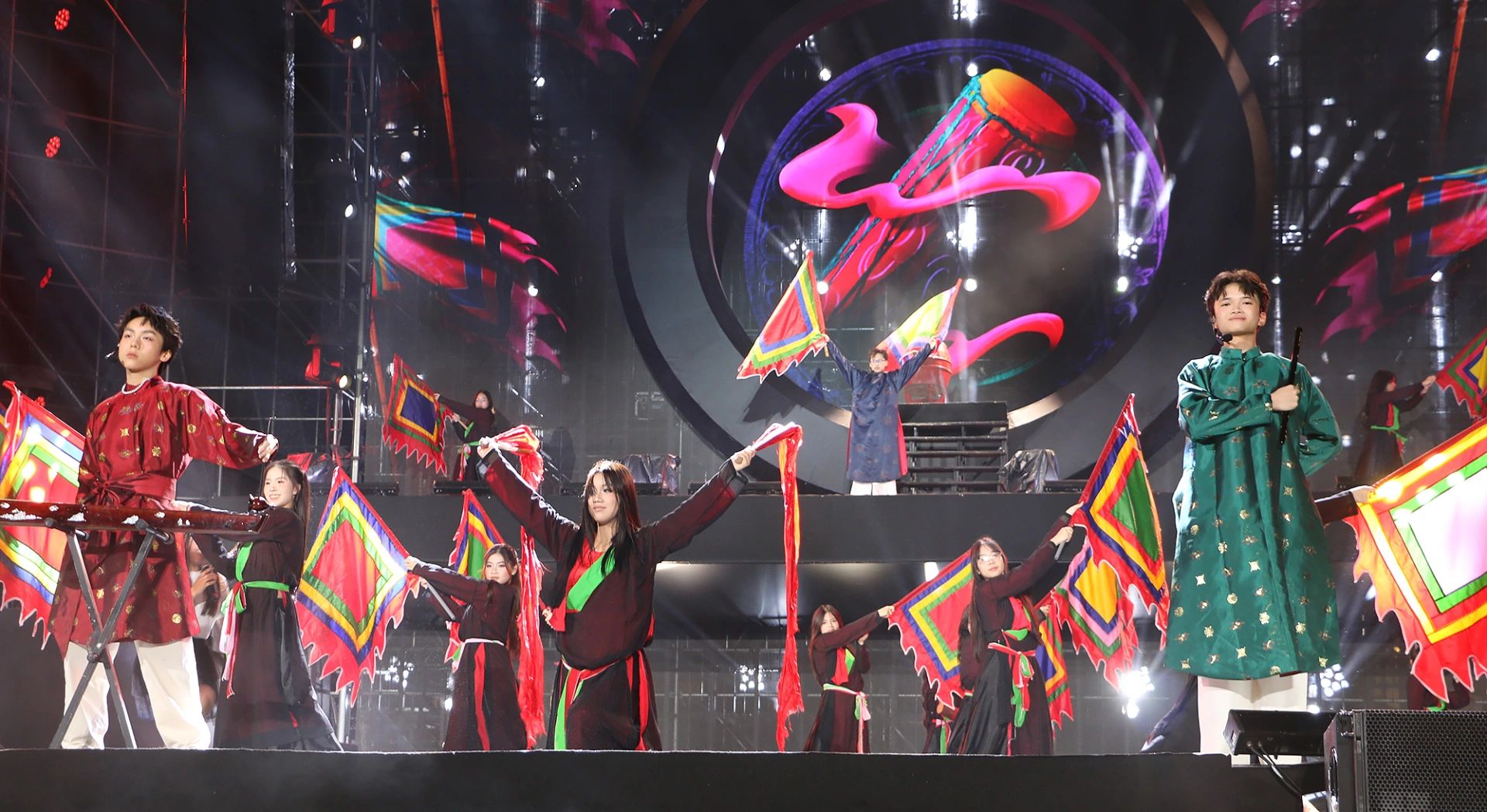 | | Tiết mục biểu diễn kết hợp giữa vũ đạo với sáo và đàn bầu của học sinh Trường phổ thông song ngữ liên cấp Wellspring, với chủ đề Trống Cơm |