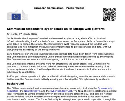 Ngày 24/3, Ủy ban châu Âu (EC) đã phát giác một cuộc tấn công mạng gây ảnh hưởng đến hạ tầng đám mây - nơi vận hành nền tảng trực tuyến Europa.eu của cơ quan này. Các biện pháp ứng phó khẩn cấp đã được triển khai ngay lập tức để khoanh vùng sự cố.