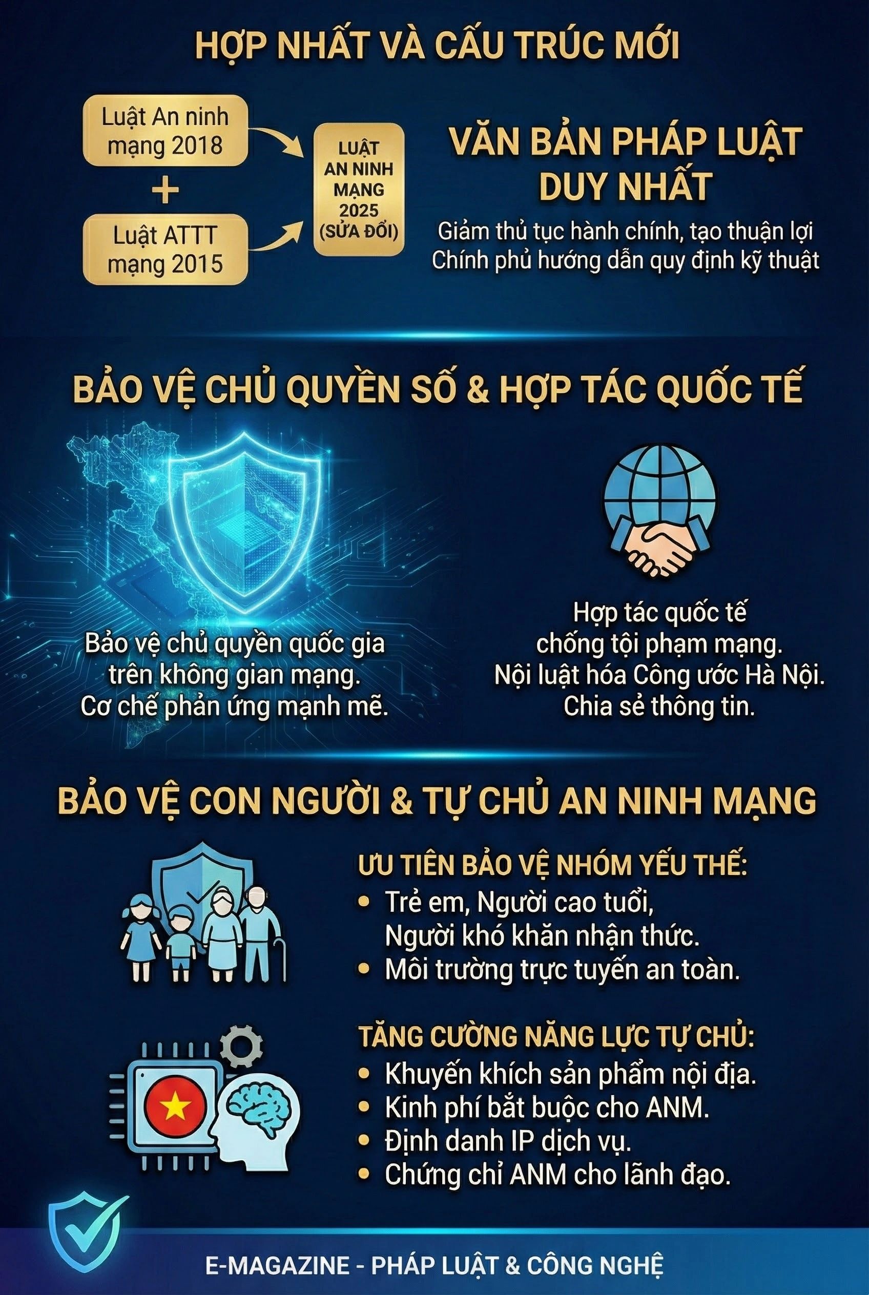 Một trong những thay đổi quan trọng nhất của Luật An ninh mạng 2025 là việc hợp nhất Luật An ninh mạng 2018 và Luật An toàn thông tin mạng 2015 thành một đạo luật thống nhất. Cách tiếp cận này nhằm khắc phục tình trạng chồng chéo trong thực thi, đồng thời tạo ra một nền tảng pháp lý xuyên suốt từ bảo vệ hệ thống thông tin, dữ liệu cho tới phòng, chống các hành vi xâm phạm an ninh quốc gia trên không gian mạng.