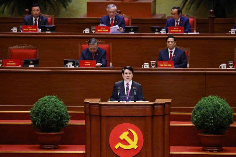 Tiếp theo chương trình, đồng chí Tổng Bí thư Tô Lâm, Trưởng Tiểu ban Văn kiện trình bày Báo cáo của Ban Chấp hành Trung ương Đảng khóa XIII về các văn kiện trình Đại hội XIV của Đảng.