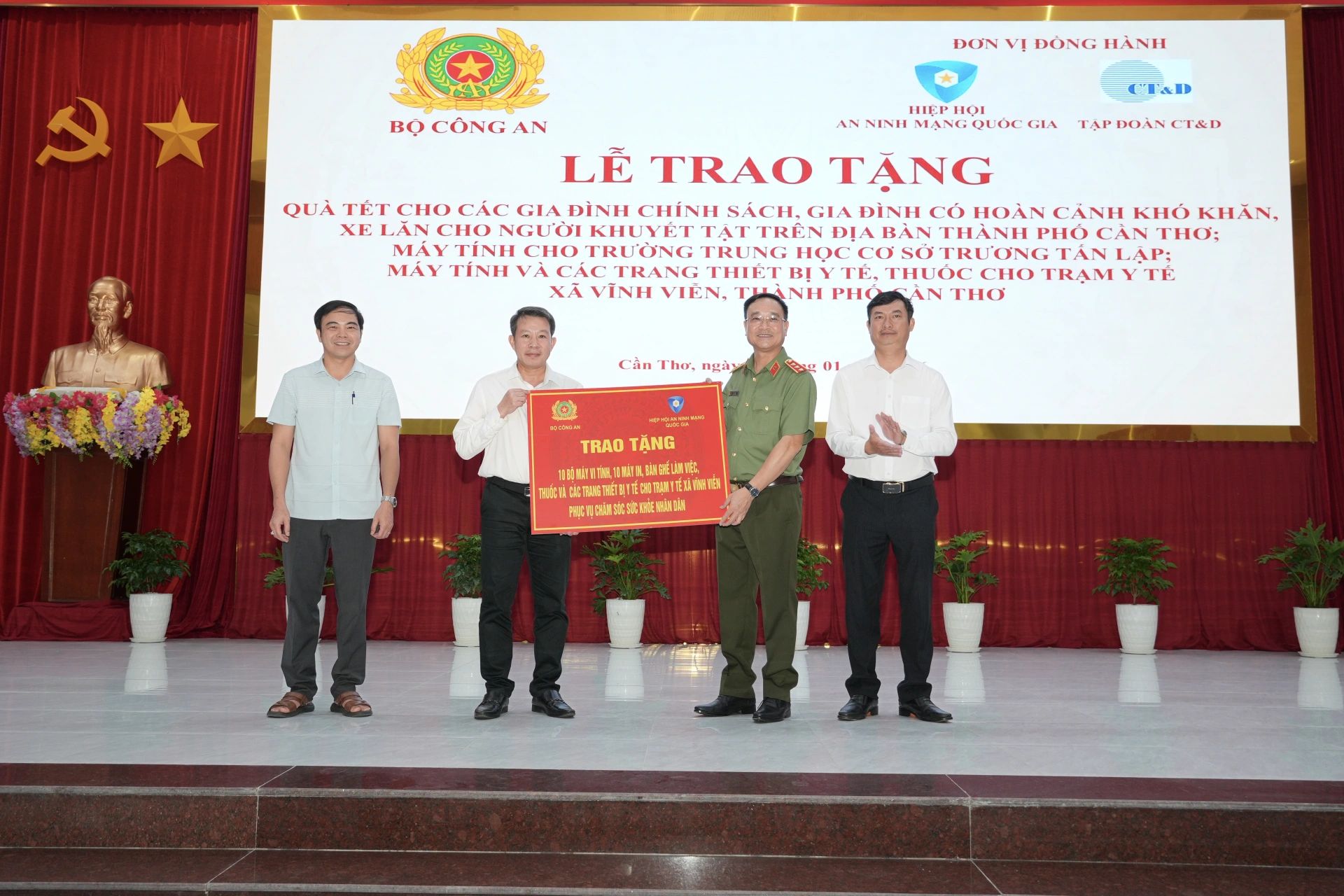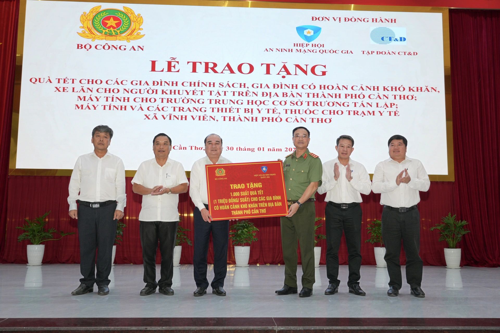 Bộ Công an phối hợp với Hiệp hội An ninh mạng quốc gia, Công ty Cổ phần Công nghệ An ninh mạng Quốc gia Việt Nam (NCS) và Tập đoàn CT&D tổ chức Lễ trao tặng quà Tết cho các gia đình chính sách, gia đình có hoàn cảnh khó khăn; trao xe lăn cho người khuyết tật; đồng thời hỗ trợ máy tính cho trường học và trang thiết bị y tế, thuốc men cho trạm y tế cơ sở trên địa bàn Cần Thơ.