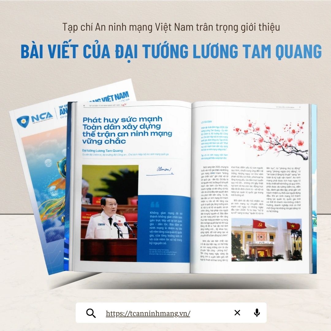 Nhân dịp Xuân Bính Ngọ 2026, Tạp chí điện tử An ninh mạng Việt Nam ra mắt Ấn phẩm Xuân với chủ đề Kiến tạo tương lại số an toàn và tự chủ. Đại tướng Lương Tam Quang - Ủy viên Bộ Chính trị, Bộ trưởng Bộ Công an, Chủ tịch Hiệp hội An ninh mạng quốc gia đã dành riêng cho Tạp bài viết với tiêu đề: “Phát huy sức mạnh toàn dân xây dựng thế trận an ninh mạng vững chắc”.