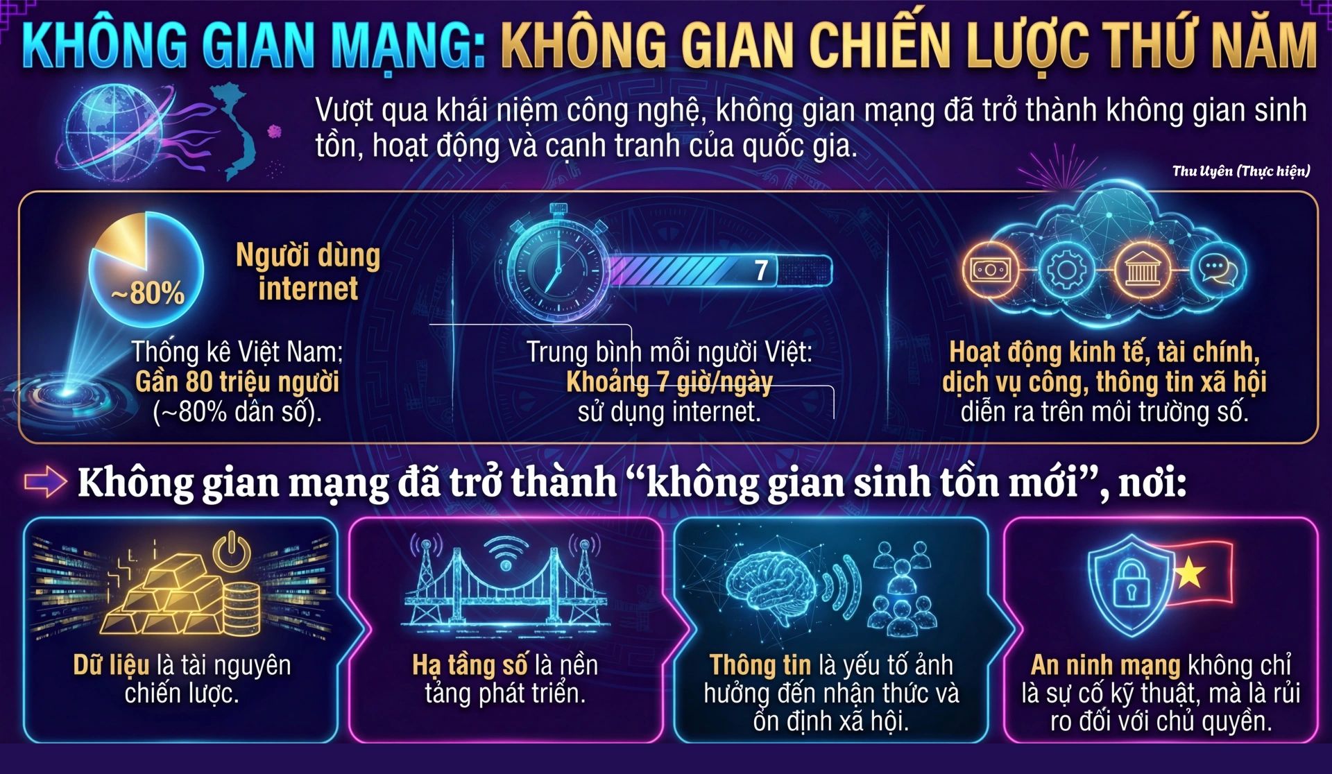 Bước sang năm 2026, chúng ta bước vào một giai đoạn mà không gian mạng đã trở thành “không gian chiến lược” gắn chặt với lợi ích quốc gia - dân tộc. Dữ liệu là tài nguyên mới, hạ tầng số là huyết mạch vận hành của Nhà nước, doanh nghiệp và đời sống xã hội; niềm tin số là điều kiện quyết định cho phát triển bền vững. Từ đó, bảo đảm an ninh mạng trở thành nhiệm vụ bảo vệ nền tảng của quản trị quốc gia, tăng trưởng kinh tế, trật tự xã hội và quyền, lợi ích chính đáng, hợp pháp của người dân trong kỷ nguyên số. Bảo đảm an ninh mạng phải tạo nền tảng thực hiện thắng lợi nhiệm vụ trọng tâm mà Nghị quyết Đại hội XIV của Đảng đã đề ra “xác lập mô hình tăng trưởng mới..., lấy khoa học, công nghệ, đổi mới sáng tạo và chuyển đổi số làm động lực chính”.