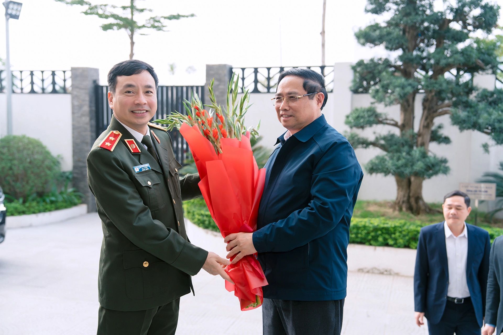 | Trung tướng Lê Xuân Minh, Cục trưởng Cục A05 đón tiếp, tặng hoa Thủ tướng Phạm Minh Chính |